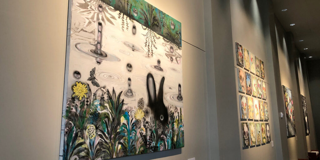 The installation of smaller paintings is from Spring Hoax, a vibrant visceral body of work featuring skulls enmeshed in jewel toned flowers and playfully rendered insects. Conceived during the pandemic, these sensuous paintings draw from a range of influences, blending elements of Vanitas and Day of the Dead imagery. Vanitas paintings, a hallmark of the European Renaissance, served as stark reminders of life’s impermanence and the fleeting nature of material wealth. Similarly, references to Day of the Dead imagery infuse the work with a sense of celebration and remembrance, emphasizing the connection between life and death. The vivid colors and playful depictions of insects and flowers in the paintings capture the joyful spirit of this tradition, where death is embraced as a natural part of the human experience.