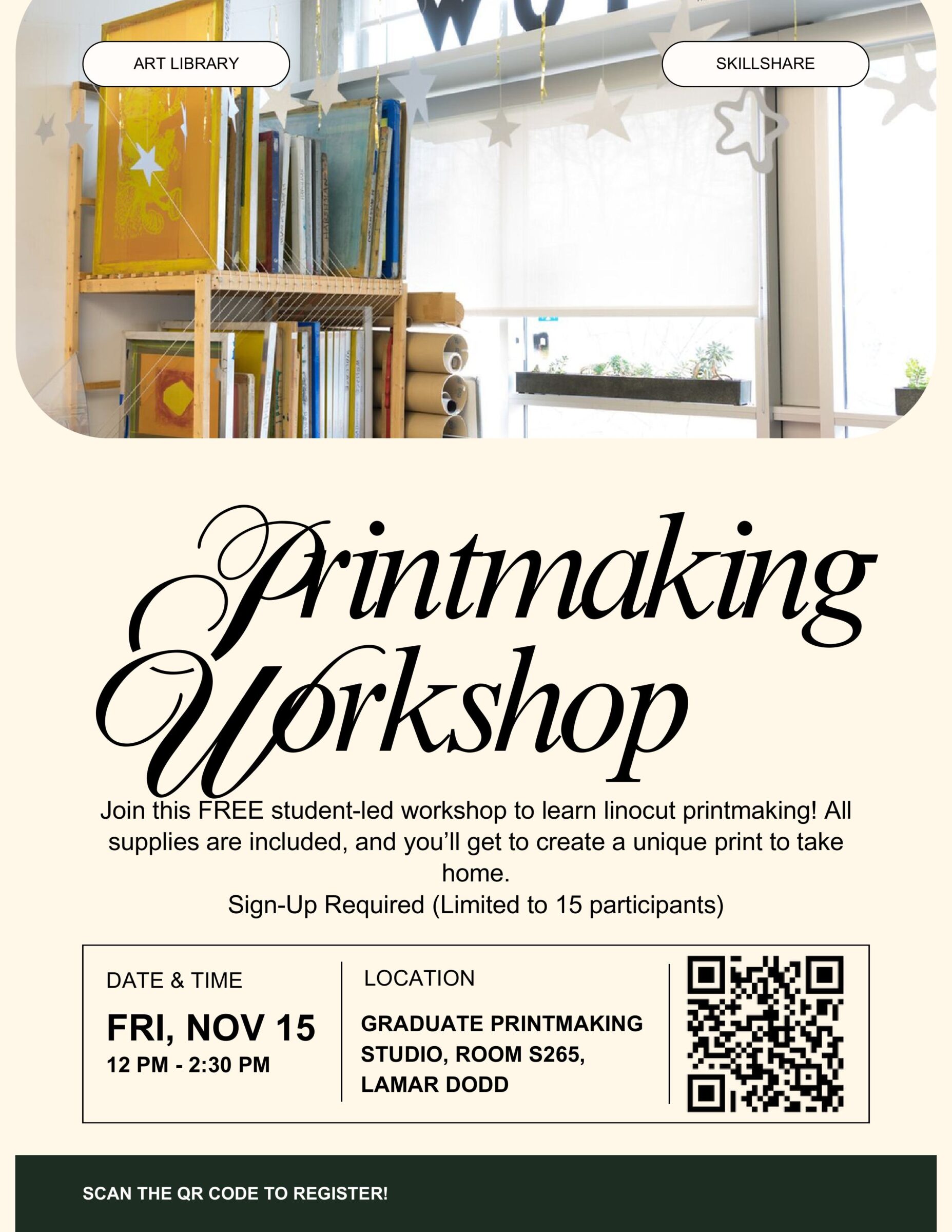 Nov 15 Printmaking Workshop November 15th, 2024 at 12:00 pm Lamar Dodd School of Art, Room S265 | Graduate Printmaking Studio November 15th, 2024 at 12:00 pm Lamar Dodd School of Art, Room S265 | Graduate Printmaking Studio