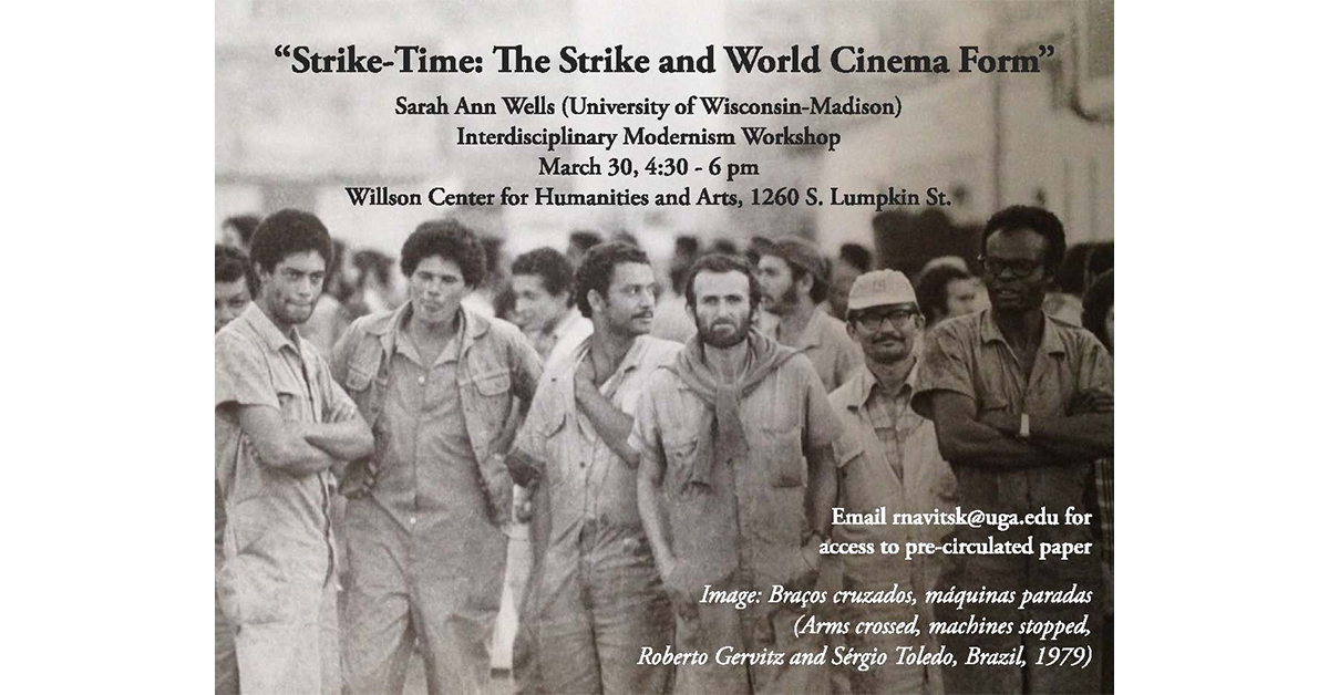 Mar 30 Sarah Ann Wells, “Strike-Time: The Strike as World Cinema Form” March 30th, 2023 at 4:30 pm Willson Center for the Humanities & Arts | 1260 S. Lumpkin Street March 30th, 2023 at 4:30 pm Willson Center for the Humanities & Arts | 1260 S. Lumpkin Street