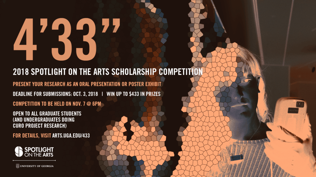 HomeEvents Call for Proposals: 4’33” 2018 Spotlight on Arts Scholarship Competition October 2nd, 2018 at 8:00 pm Add to Calendar Google Calendar iCalendar (.ics) Outlook 365 Outlook Live Date & Time October 2nd, 2018 at 8:00 pm LocationUniversity of Georgia Type of EventGeneral Upcoming EventsView All Events October 9 Fall Exhibitions Opening + MFA Open Studios October 9th, 2025 at 5:00 pm Ceramics Bldg., Dodd Galleries, Lamar Dodd School of Art October 9th, 2025 at 5:00 pm Ceramics Bldg., Dodd Galleries, Lamar Dodd School of Art October 9 Ann Orr Morris Memorial Fund Lecture | Katie Kameen October 9th, 2025 at 5:30 pm Lamar Dodd School of Art | S151 October 9th, 2025 at 5:30 pm Lamar Dodd School of Art | S151 October 14 Visiting Artist Lecture | Jen de los Reyes October 14th, 2025 at 5:30 pm 270 River Road | S150, Main Building October 14th, 2025 at 5:30 pm 270 River Road | S150, Main Building October 16 AGAS Guest Lecture with Dr. Carolina Mangone October 16th, 2025 at 5:30 pm Lamar Dodd School of Art | S150 October 16th, 2025 at 5:30 pm Lamar Dodd School of Art | S150 October 23 Graduate Studies Virtual Info Session | Art Education October 23rd, 2025 at 7:00 pm Zoom October 23rd, 2025 at 7:00 pm Zoom