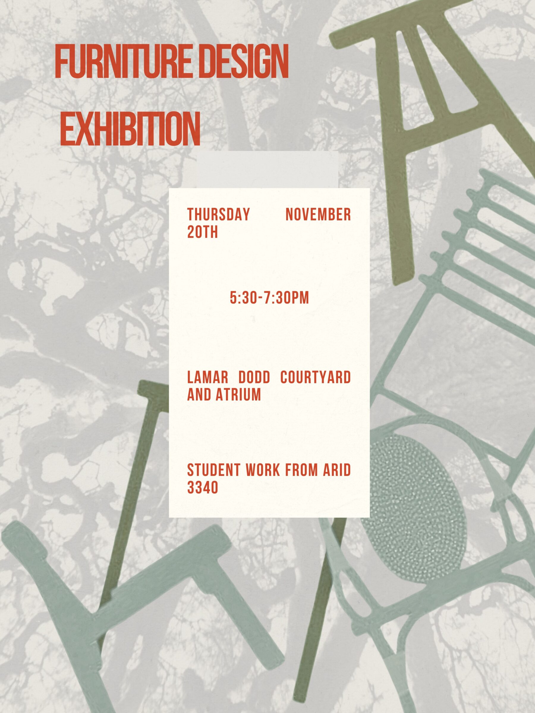 November 20 Furniture Design Exhibition November 20th, 2025 at 5:30 pm Atrium, Courtyard at the Dodd November 20th, 2025 at 5:30 pm Atrium, Courtyard at the Dodd