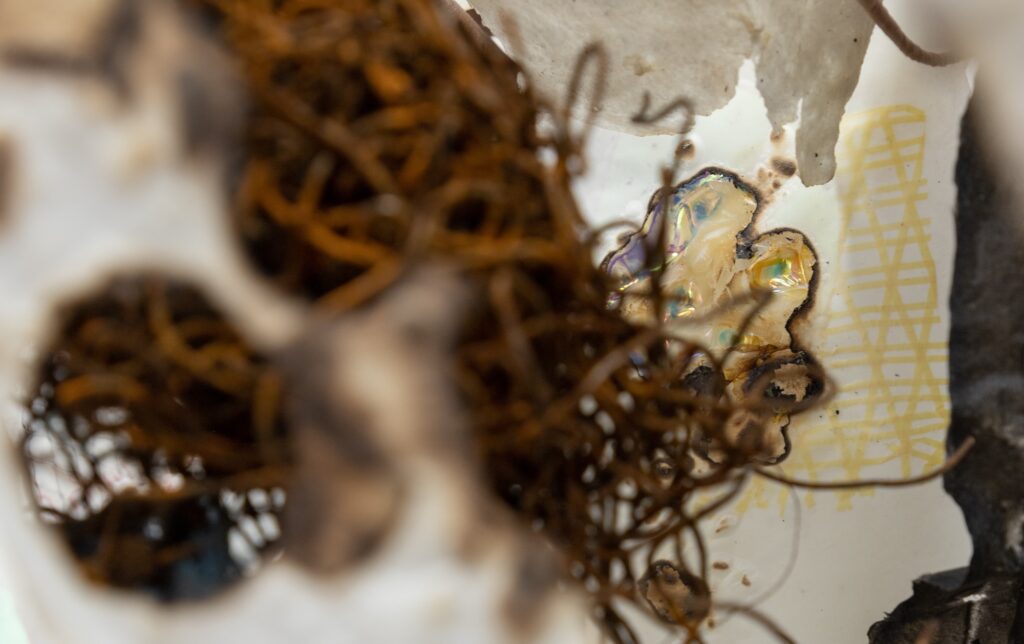 The three featured exhibitions include Insect Politics, a collaborative exploration of the divine through reflective texts, musical instruments, ceramic objects, and a site-specific installation produced by MFA students Hayden Maltese and Alejandro Ramirez and curated by Master’s candidate in art history Kaitlyn Morrison; In-between, a series of two-sided paintings on transparent panel elaborated by art education PhD student Amos Manlagit with invited artists in an investigation of how collaborators negotiate a unified aesthetic; and a body of hours, an installation by MFA student Caitlin La Dolce, who pulls together papermaking, steel fabrication, and mold casting, among other processes, to assemble repetitive textures conveying transformation amid toxicity.