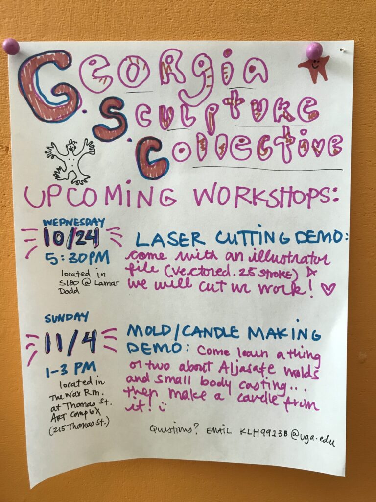 HomeEvents Georgia Sculpture Collective Workshop: Mold/Candle Making Demo November 4th, 2018 at 1:30 pm Add to Calendar Google Calendar iCalendar (.ics) Outlook 365 Outlook Live Date & Time November 4th, 2018 at 1:30 pm – November 4th, 2018 at 3:00 pm LocationThomas Street Art Complex | The Wax Room Type of EventWorkshop Academic AreaSculpture Come learn a thing or two about Aljasate molds and small body casting… then make a candle from it! Questions, email klh99138@uga.edu. Upcoming EventsView All Events November 4 Fall Exhibitions Opening + MFA Open Studios November 4th, 2018 at 1:30 pm November 4th, 2018 at 1:30 pm November 4 Ann Orr Morris Memorial Fund Lecture | Katie Kameen November 4th, 2018 at 1:30 pm November 4th, 2018 at 1:30 pm November 4 Visiting Artist Lecture | Jen de los Reyes November 4th, 2018 at 1:30 pm November 4th, 2018 at 1:30 pm November 4 AGAS Guest Lecture with Dr. Carolina Mangone November 4th, 2018 at 1:30 pm November 4th, 2018 at 1:30 pm November 4 Graduate Studies Virtual Info Session | Art Education November 4th, 2018 at 1:30 pm November 4th, 2018 at 1:30 pm