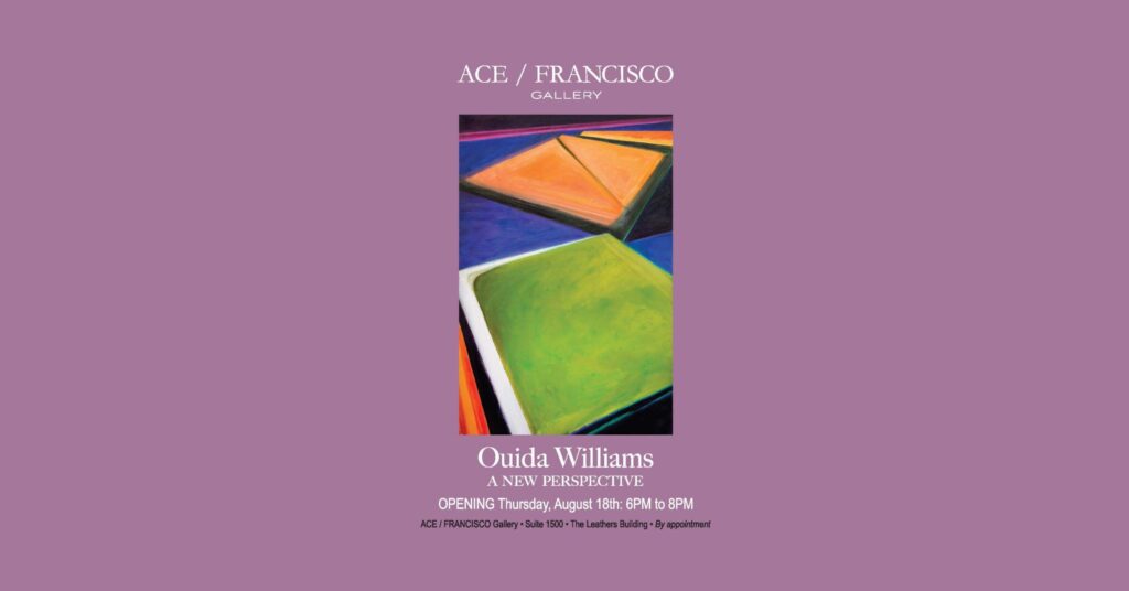 From 2005 through 2020, Williams’ painting studio was in Suite 1500 of the Leathers Building, where ACE / FRANCISCO is currently. Since Williams passed away during Covid lockdown, many of her friends who spent time with her in the studio over the years were not able to say goodbye. The new owners of Suite 1500 thought it only fitting to host Ouida Williams: A New Perspective in the hopes that old friends—and those new to her work—could spend time in the gallery in her honor.