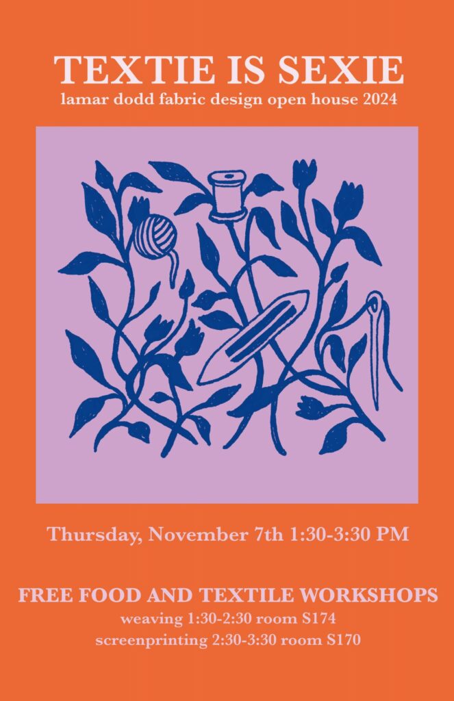 Join faculty and students from the Fabric Design area for “Textie is Sexie”, a 2024 open house with free food and workshops in weaving and screenprinting in the south wing of the first floor of the Lamar Dodd School of Art’s main building.
