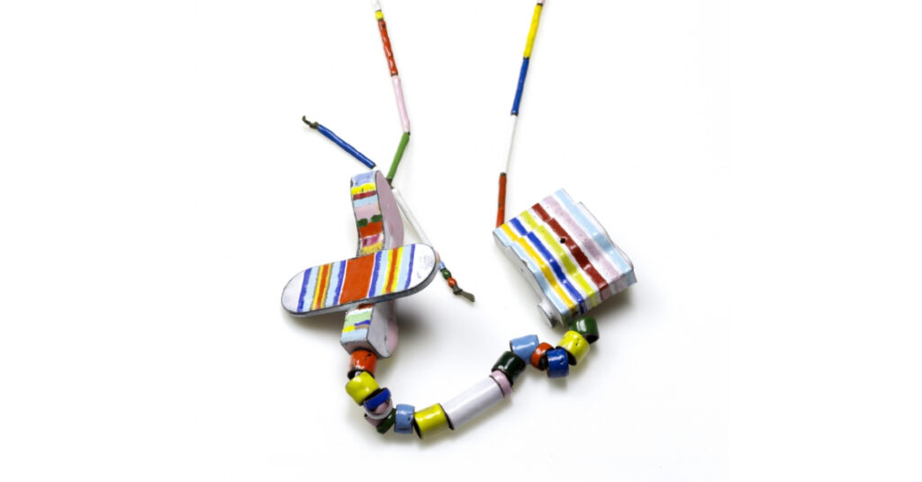An accomplished poet as well as an immensely inventive enamelist, Aaron Decker creates wearable forms that are both personally referential and resoundingly universal. Much of the layered imagery in his work has to do with childhood memories – some pleasant and reassuring, others, darker and more foreboding. Raised in a military family, he moved frequently while growing up and came out to his family when he was 16. As the gay son of military father, he grew up an outsider, developing deeply ambivalent feelings about the US military and its aggressive ideals. Many of the allusions in his work (medals, planes, camouflage, etc.) reference this military context and reflect Decker’s astute critical stance.
