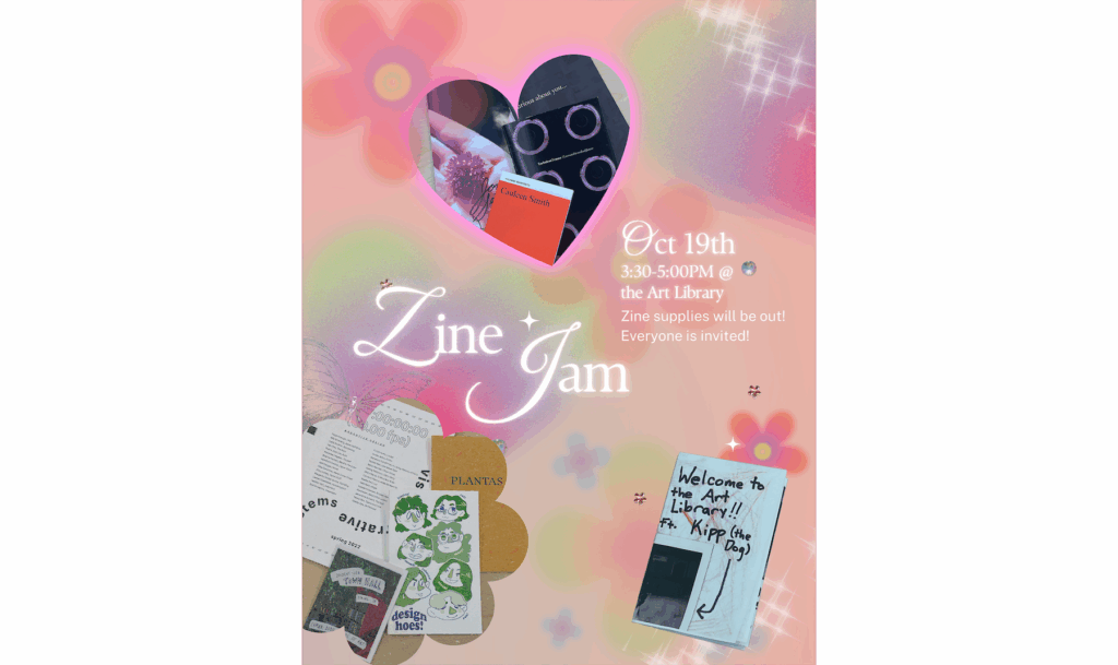 HomeEvents Zine Jam October 19th, 2023 at 3:30 pm Add to Calendar Google Calendar iCalendar (.ics) Outlook 365 Outlook Live Date & Time October 19th, 2023 at 3:30 pm – November 16th, 2023 at 5:00 pm LocationArt Library | Lamar Dodd School of Art SponsorArt Library Join the Art Library for a Zine Jam! Zine supplies will be out and everyone is invited. Upcoming EventsView All Events November 4 Art History Faculty Lecture | Caitlin Elizabeth Mims November 4th, 2025 at 5:30 pm Lamar Dodd School of Art | N100 November 4th, 2025 at 5:30 pm Lamar Dodd School of Art | N100 November 5 Graduate Studies Virtual Info Session | MFA Studio Art November 5th, 2025 at 12:30 pm Zoom November 5th, 2025 at 12:30 pm Zoom November 7 Fall 2025 Dodd Market November 7th, 2025 at 11:00 am Lamar Dodd School of Art | Atrium + Courtyard November 7th, 2025 at 11:00 am Lamar Dodd School of Art | Atrium + Courtyard November 8 Natural History: Georgia Review Interdisciplinary Symposium November 8th, 2025 at 2:00 pm Athenaeum | 287 W Broad St. Athens November 8th, 2025 at 2:00 pm Athenaeum | 287 W Broad St. Athens November 11 Jack Davis Lecture | Guido de Boer November 11th, 2025 at 5:30 pm Lamar Dodd School of Art | S151 November 11th, 2025 at 5:30 pm Lamar Dodd School of Art | S151