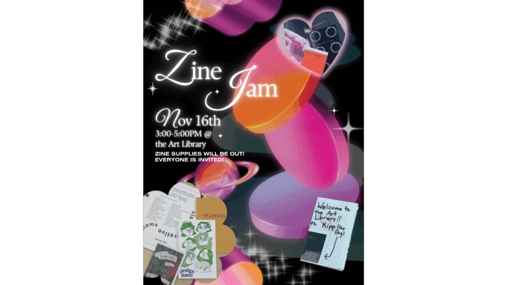 HomeEvents Zine Jam November 16th, 2023 at 3:00 pm Add to Calendar Google Calendar iCalendar (.ics) Outlook 365 Outlook Live Date & Time November 16th, 2023 at 3:00 pm – November 16th, 2023 at 5:00 pm LocationArt Library | Lamar Dodd School of Art SponsorArt Library Join the Art Library for a Zine Jam! Zine supplies will be out and everyone is invited. Upcoming EventsView All Events November 4 Art History Faculty Lecture | Caitlin Elizabeth Mims November 4th, 2025 at 5:30 pm Lamar Dodd School of Art | N100 November 4th, 2025 at 5:30 pm Lamar Dodd School of Art | N100 November 5 Graduate Studies Virtual Info Session | MFA Studio Art November 5th, 2025 at 12:30 pm Zoom November 5th, 2025 at 12:30 pm Zoom November 7 Fall 2025 Dodd Market November 7th, 2025 at 11:00 am Lamar Dodd School of Art | Atrium + Courtyard November 7th, 2025 at 11:00 am Lamar Dodd School of Art | Atrium + Courtyard November 8 Natural History: Georgia Review Interdisciplinary Symposium November 8th, 2025 at 2:00 pm Athenaeum | 287 W Broad St. Athens November 8th, 2025 at 2:00 pm Athenaeum | 287 W Broad St. Athens November 11 Jack Davis Lecture | Guido de Boer November 11th, 2025 at 5:30 pm Lamar Dodd School of Art | S151 November 11th, 2025 at 5:30 pm Lamar Dodd School of Art | S151