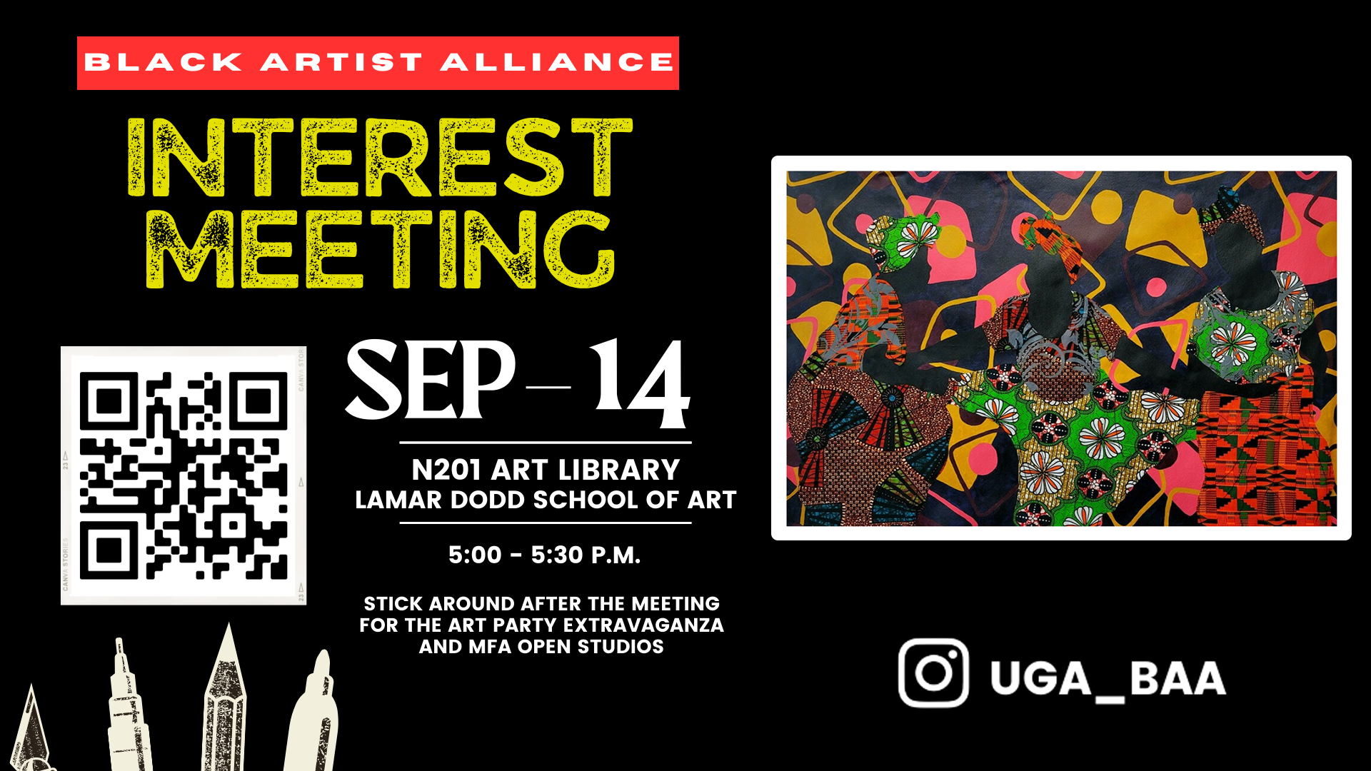 Sep 14 UGA Black Artists Alliance (BAA) Meeting September 14th, 2023 at 5:00 pm Art Library | N201 September 14th, 2023 at 5:00 pm Art Library | N201