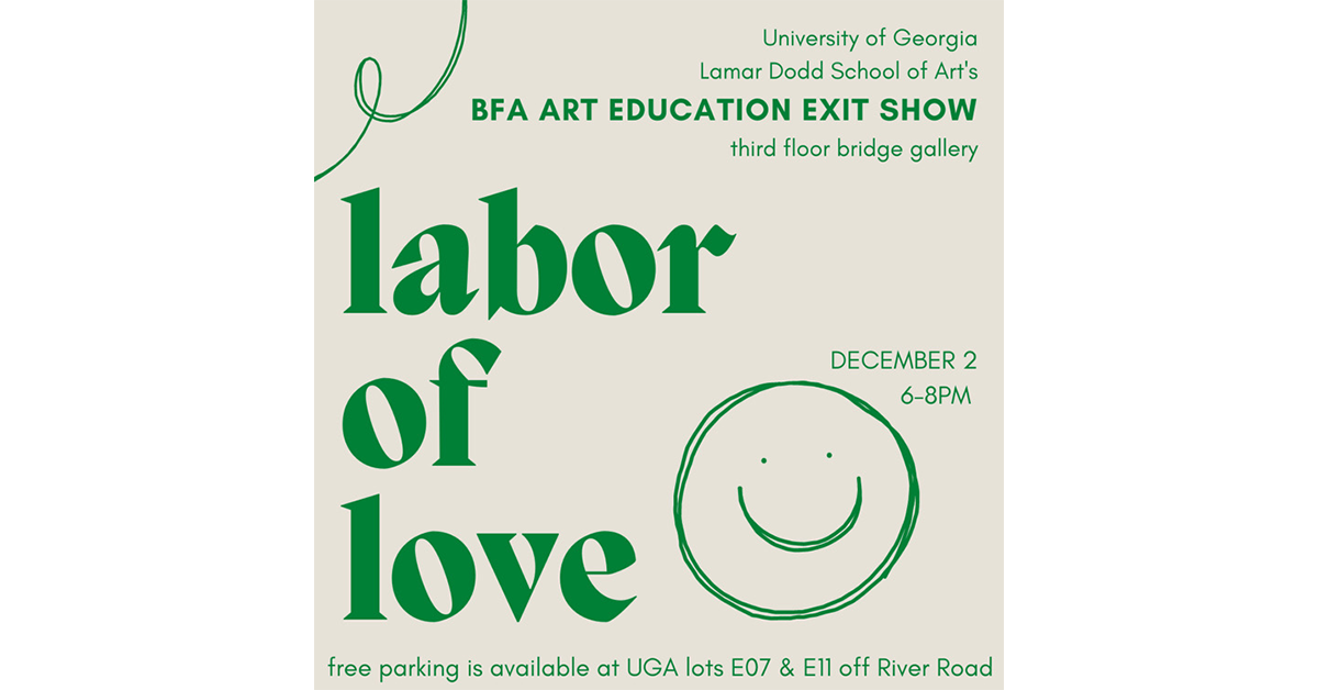 Dec 2 Labor of Love: BFA Art Education Exit Exhibition Opening Reception December 2nd, 2022 at 6:00 pm Lamar Dodd School of Art | Bridge Gallery December 2nd, 2022 at 6:00 pm Lamar Dodd School of Art | Bridge Gallery