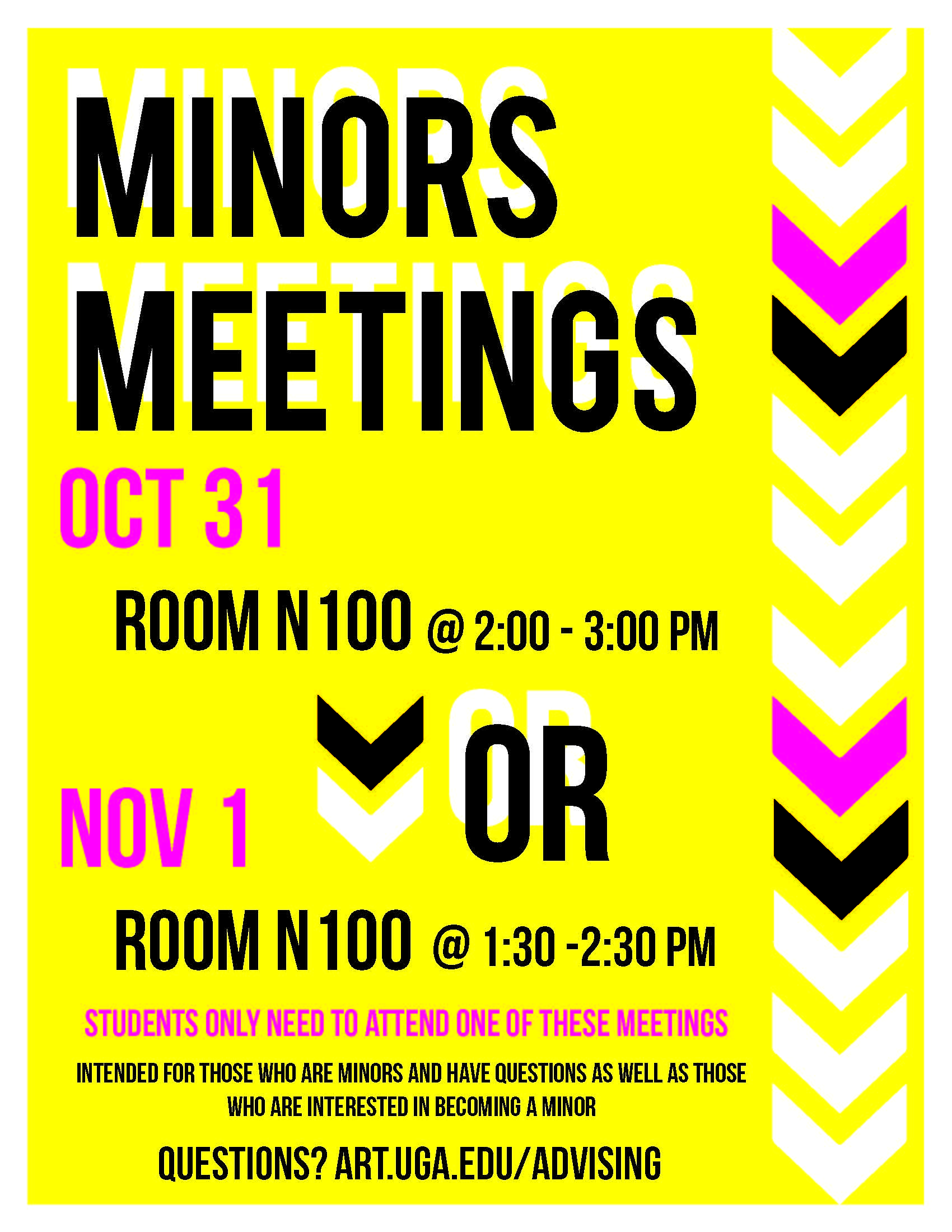 Oct 30 Minors Meetings: Information Sessions October 30th, 2017 at 8:00 pm Lamar Dodd School of Art | N100 October 30th, 2017 at 8:00 pm Lamar Dodd School of Art | N100