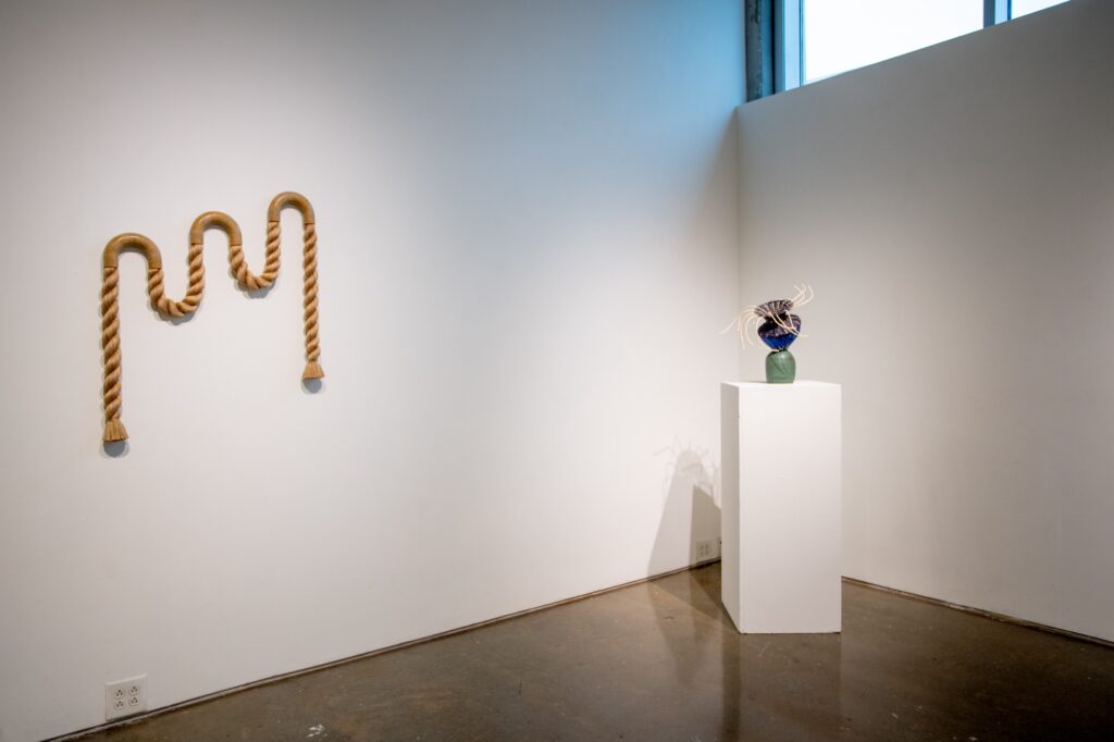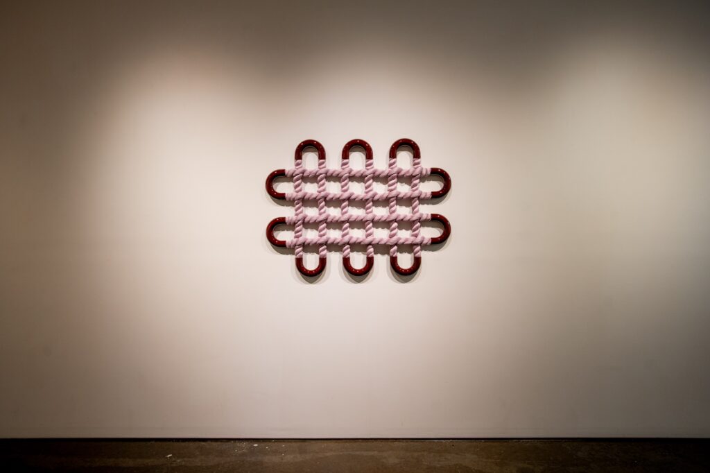To Wander a Well Worn Path presents the act of weaving, a millennia-old tradition rooted in survival and functionality, in relation to contemporary abstraction and mixed media practices. Dodd MFA candidate Eliza Bentz investigates the integrity and aesthetic of weaving, tracing and in some cases magnifying, the journey of a line as it emerges into an intertwined network. The resulting works are an assemblage of ceramic and fiber sculptures, activating both the vertical and horizontal plane as organic vessels and meandering wall works. By participating in the tactility and skill of handcraft, Bentz proves that the inclinations and tactics of those who came before us are not so far behind.