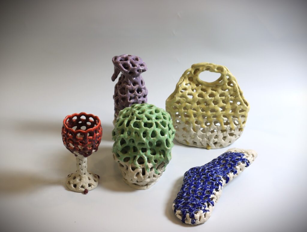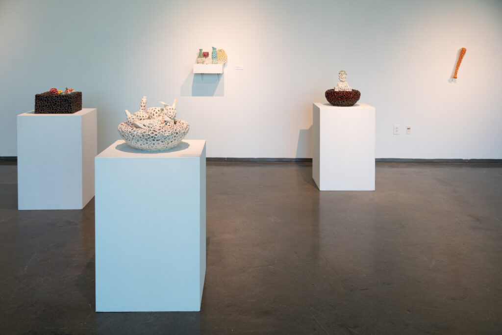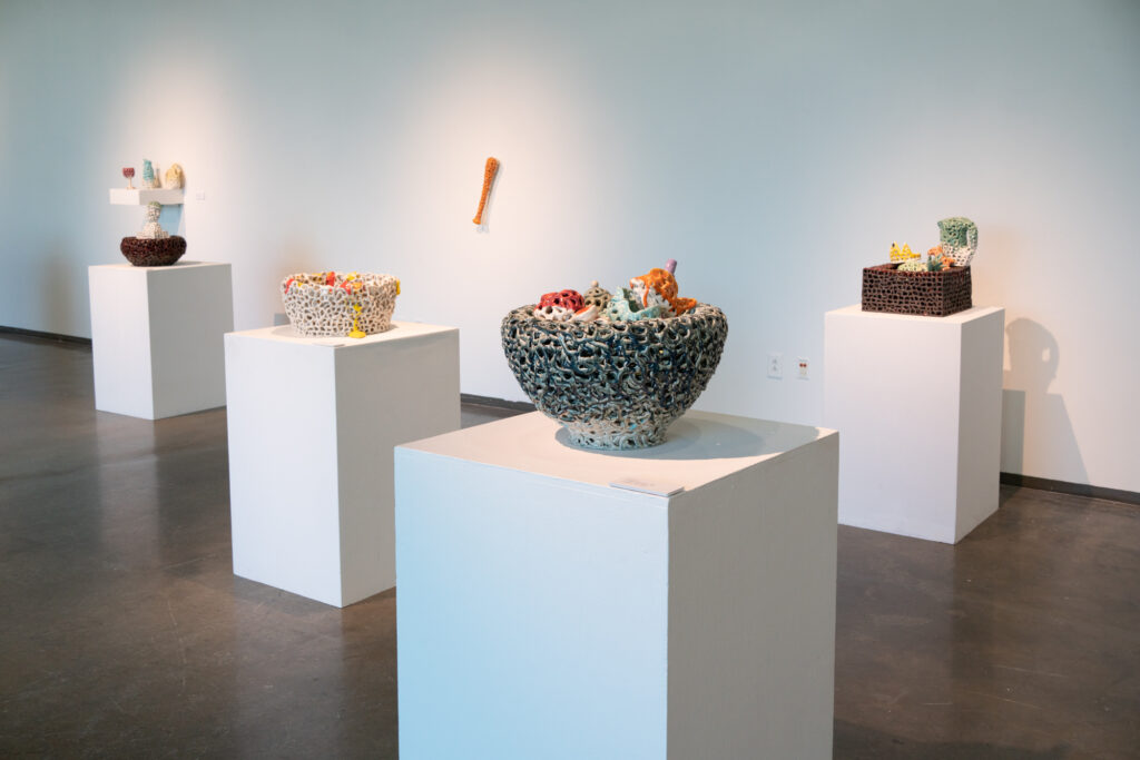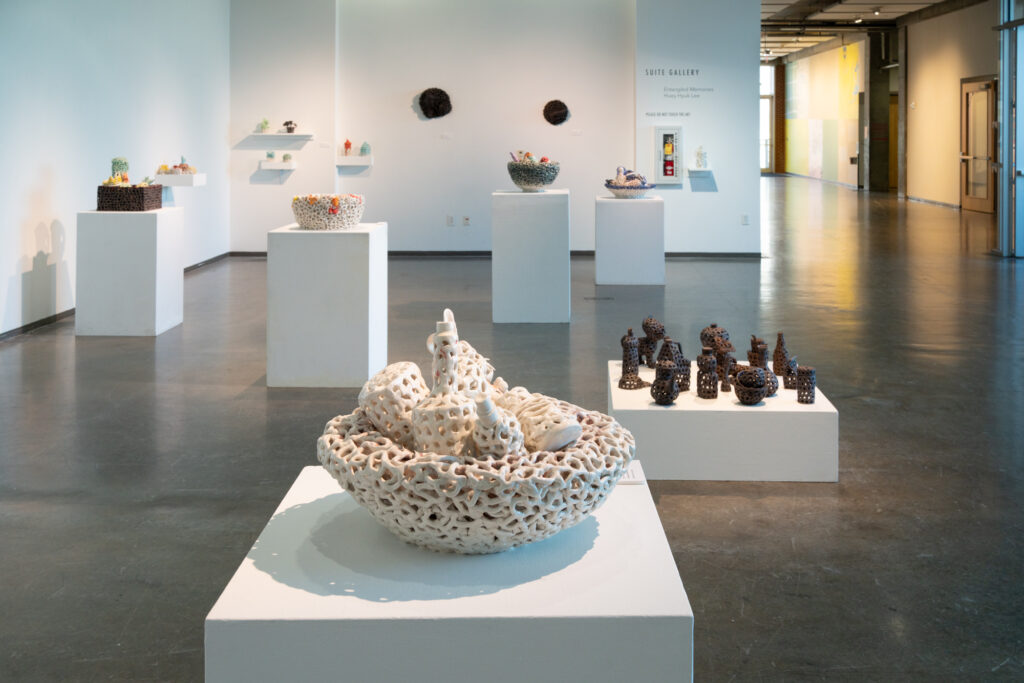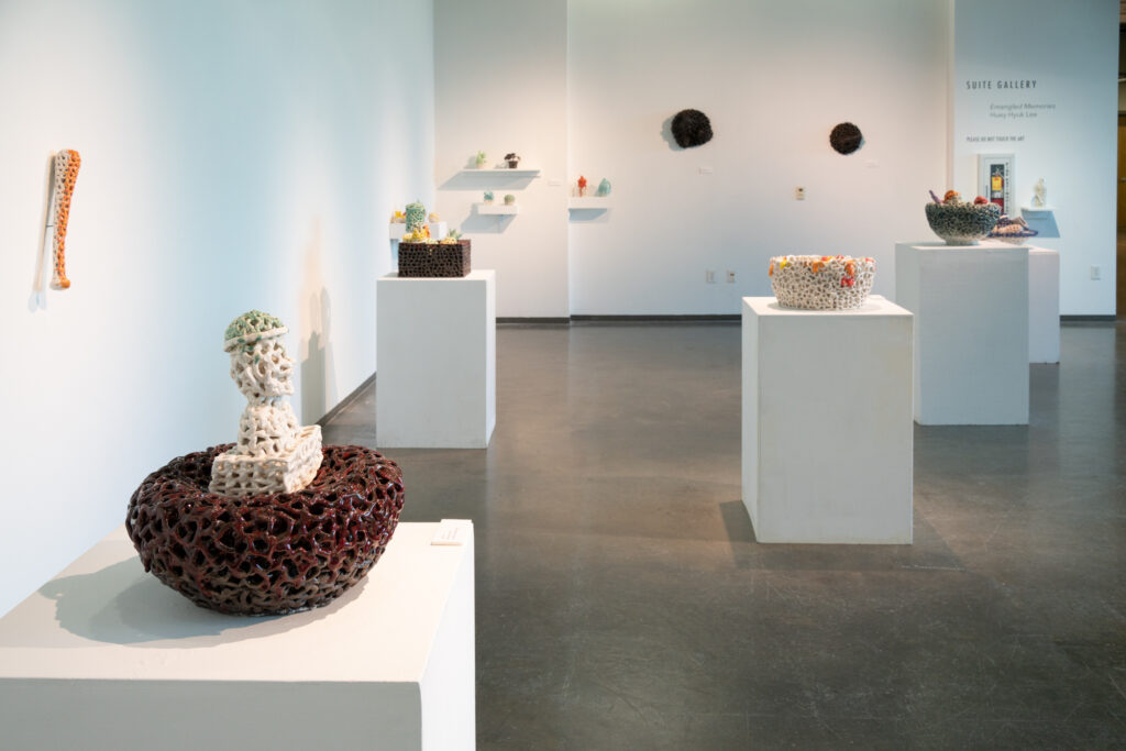 Entangled Memories is an exhibit that features new works in clay by Dodd MFA candidate, Huey Lee. The works are manipulated to appear as if they were strings that are then shaped into everyday objects. The objects represents Lee’s investigation into his identity as it relates to history, trauma, and cultural differences. Reconstructing and re-configuring his memory into clay, Lee explores his relationship to objects to better interpret his lived experience.