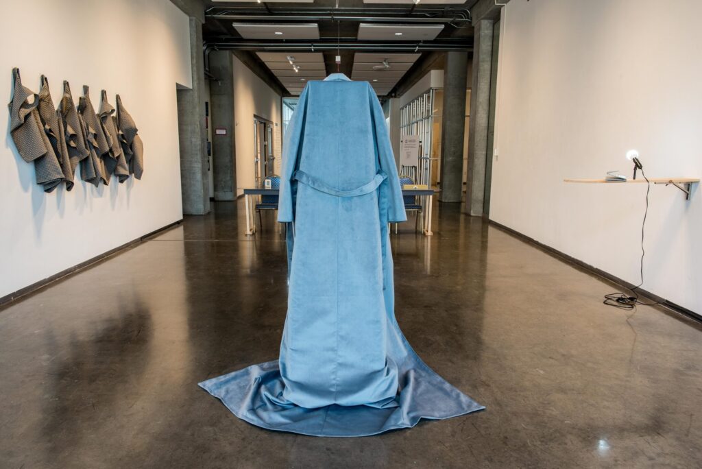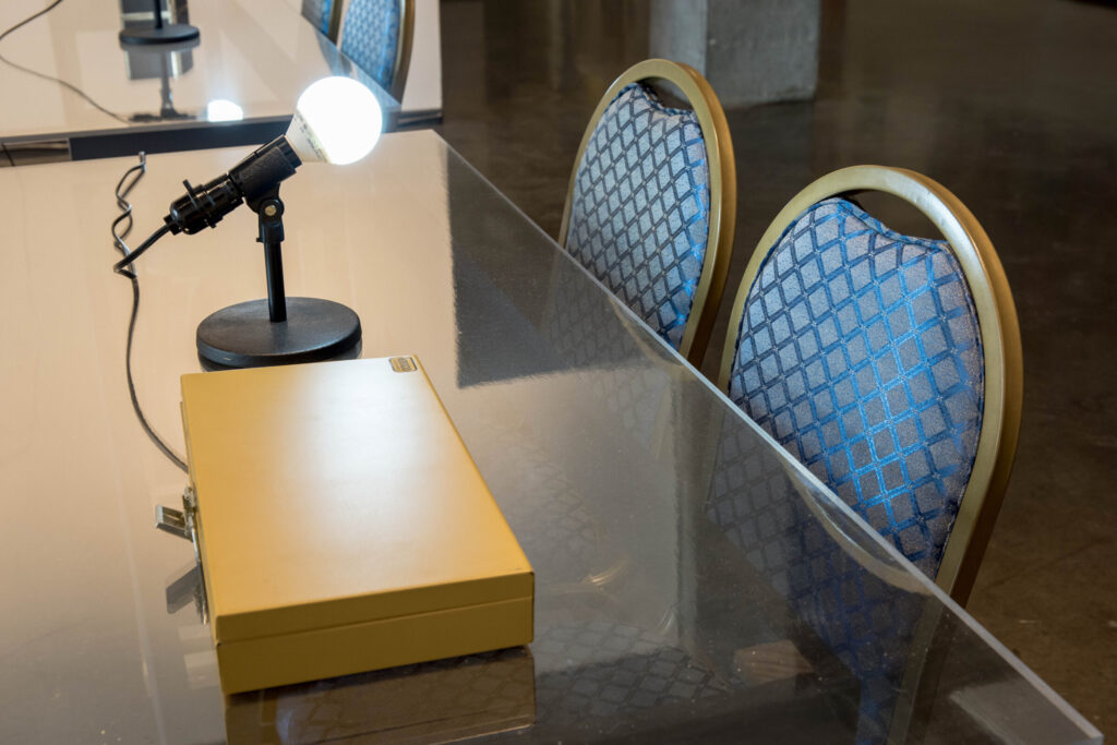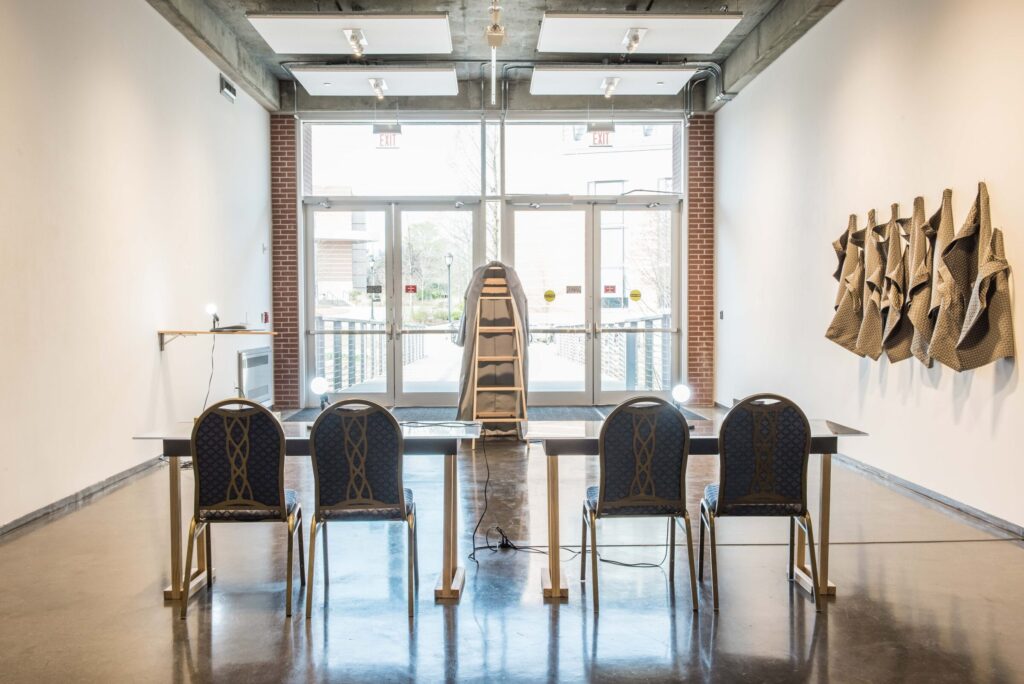 Here, Say is a new sculptural installation by Dodd post-MFA fellow in sculpture, Courtney McClellan. The installation, comprised of made and found objects, recreates a courtroom. With absurdity and poetry, the judicial system and its players are recast. Witness, defendant, plaintiff, judge, and jury conflate seeing and speaking, hearing and being seen. In this space theories are performed, arguments are made. Located at an entrance of the Lamar Dodd School of Art, the work invites practice, play and judgment.