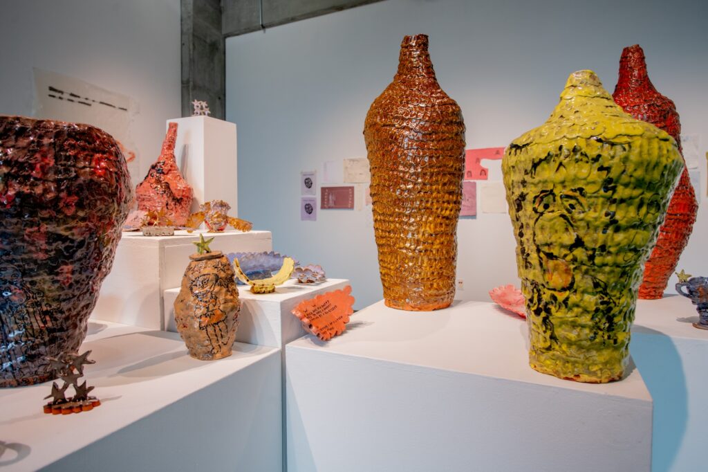 Insect Politics combines disparate vessels to conjure an interpretation of divinity that is both atmospheric and physical. Dodd MFA candidates Hayden Maltese and Alejandro Ramirez present reflective texts, musical instruments, ceramic objects, and a site-specific installation in an attempt to capture what is transitory and fleeting by nature. Visual investigations are thus fractured, utilizing ubiquitous imagery from pop culture and day-to-day life, whether pastoral, urban, or subconsciously present. A collective that is of eternal flux and subject to all possible changes, this installation coagulates, for an ephemeral moment, something that is presentable — in the search for a Being who is, and is not. This exhibition is curated by MA candidate in Art History, Kaitlyn Morrison.