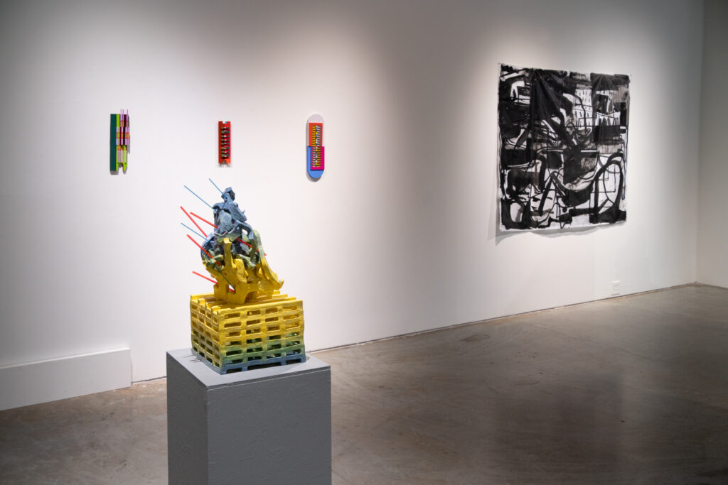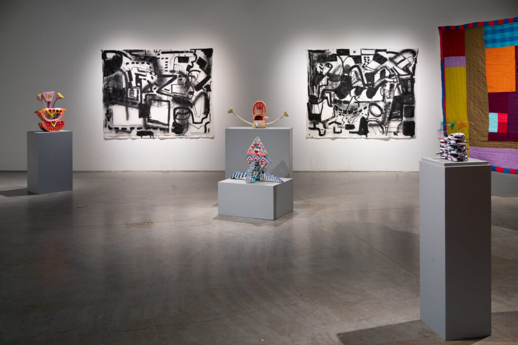 Klein’s ceramics also take up this rhythmic density. They stack together, patterned with zigzags, stripes, checkerboard, and triangles. The objects form new compositions through relationships of physical precarity. A vessel sprouts tenuous arms; a ritualistic pile leans off-center. The impression of destabilizing structures comes through again in Brosseau’s black and white paintings. Behind the angular lines, gray haze suggests erasure, giving an impression of moving through ephemeral moments. The solutions are shifting, responsive, and accumulated. As in memory and making, each instance builds upon the last. This exhibition is curated by Dodd Galleries Graduate Student Assistant, Katie Ford.