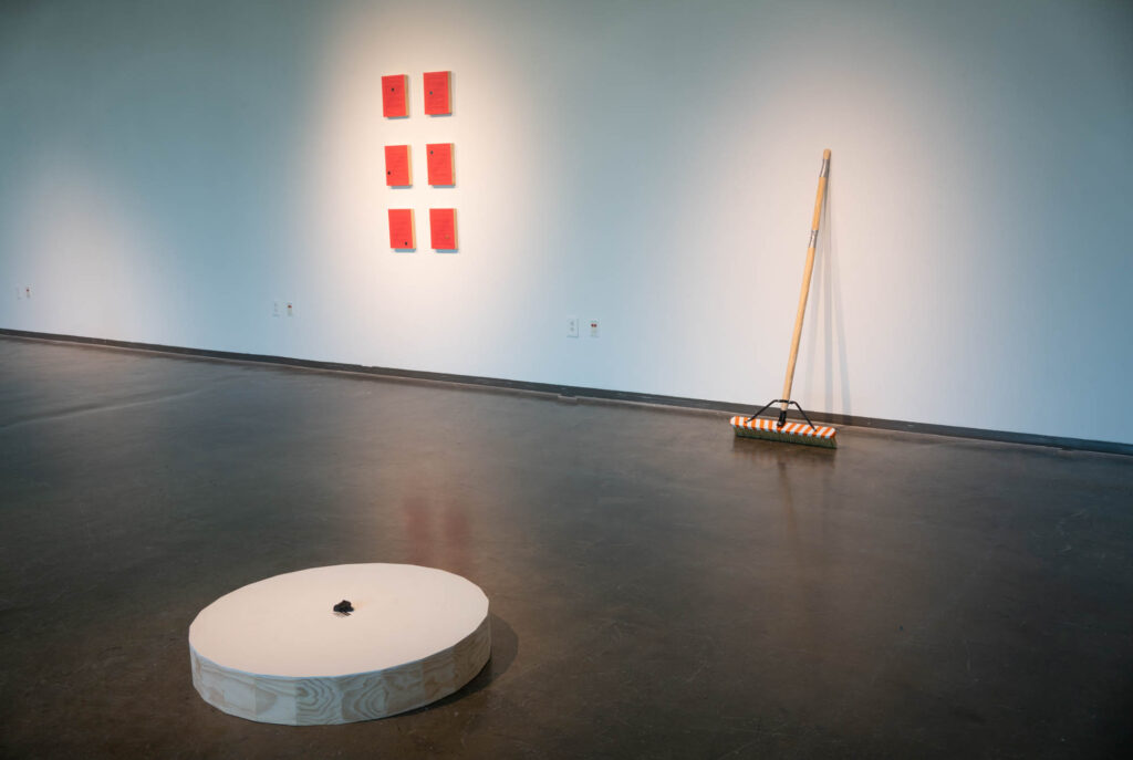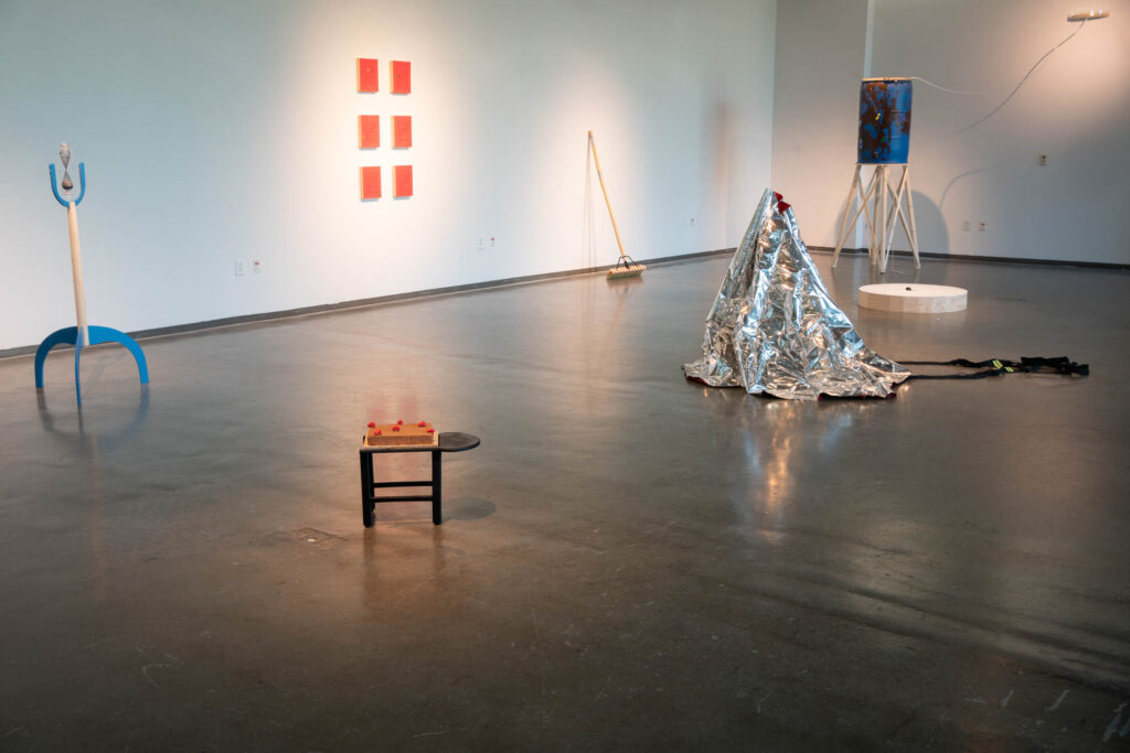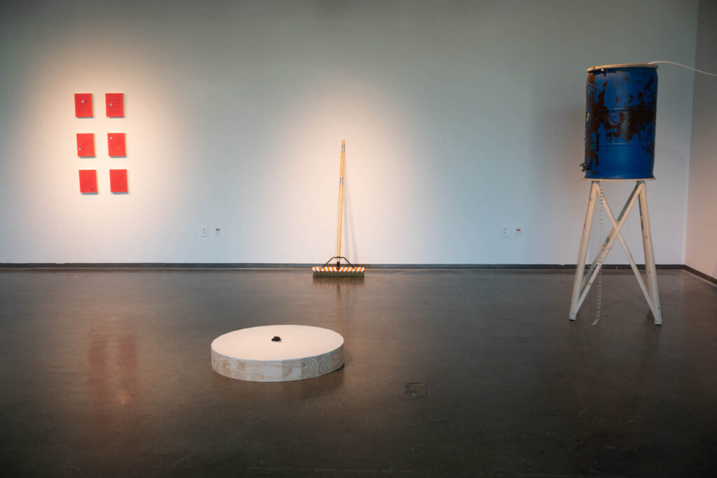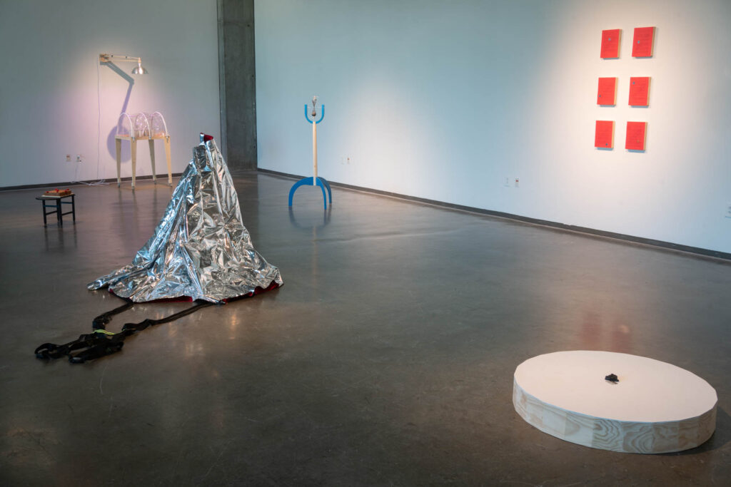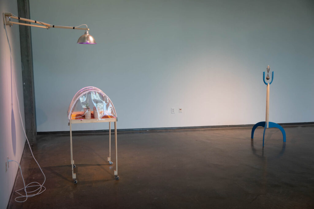 In standing by the fall, Meredith Emery, Dodd MFA candidate, considers the entanglement of the individual, ecological communities, and institutions in the climate crisis. Through the visual language of pre-industrial and industrial architecture + technology, the installation explores the impossibility of technological solutions to climate change alongside notions of power and accountability. Together, these sculptural works suggest absurd systems and tools that incorporate the phenomenological debris of our constructed environment, scientific instruments and communication, as well as the aesthetics of DIY and institutional architectures. The relationships between materials and forms set up a multiplicity of thematic blurs that bounce between works and reflect upon the inseparable relationships that characterize ecological communities.