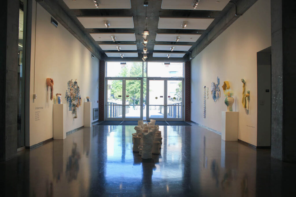 Undermined is a collaborative conversation between three MFA candidates in Textile Design and two MFA candidates in ceramics all of whom are working at the Dodd. The exhibition seeks to bring utilitarian crafts to the forefront as artistic endeavors, by creating a tangible dialogue between five artists. Yeonsoo Kim and Esther Mech created ceramic and pottery...