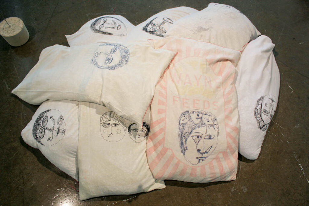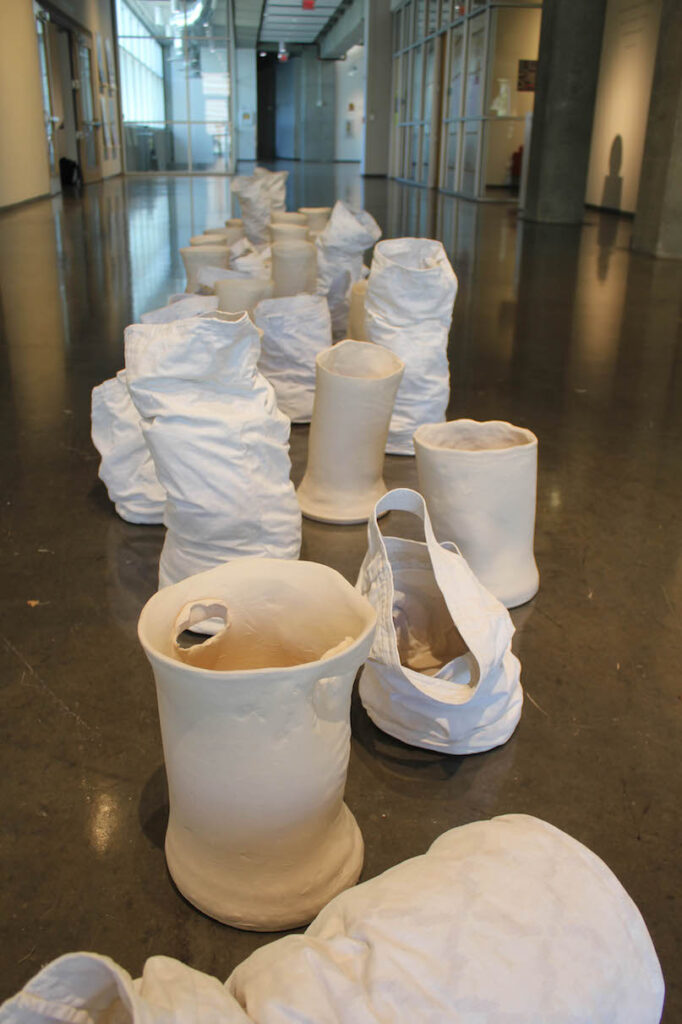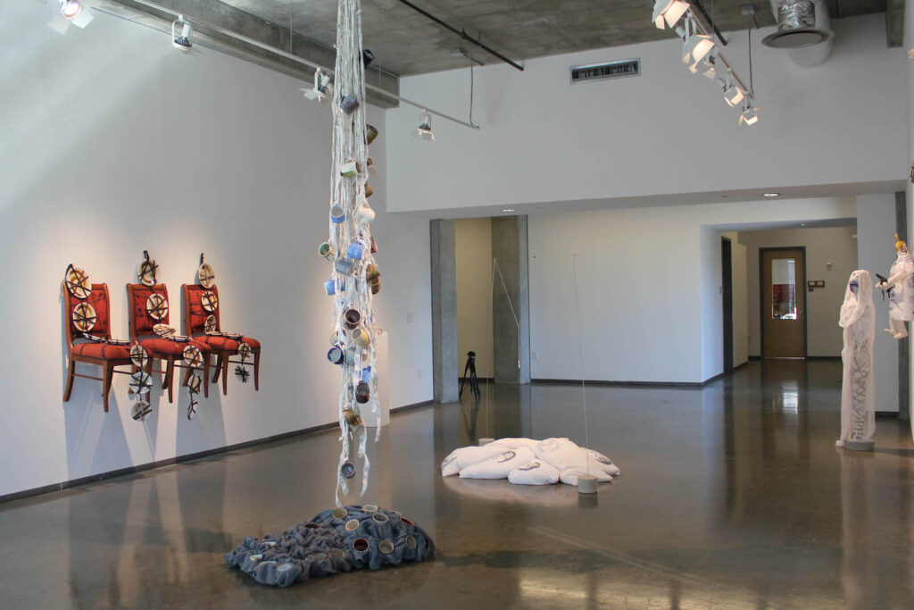 Undermined is a collaborative conversation between three MFA candidates in Textile Design and two MFA candidates in ceramics all of whom are working at the Dodd. The exhibition seeks to bring utilitarian crafts to the forefront as artistic endeavors, by creating a tangible dialogue between five artists. Yeonsoo Kim and Esther Mech created ceramic and pottery pieces which Amanda Britton, Erin Geagon and Johanna Norry responded to and manipulated using traditional textile materials and techniques, seeking to undermine the function of the original object, thus reframing the way the object could be engaged with and viewed. The physical differences between these sets of materials provides additional innate tensions, while the linked contexts of utilitarian craft development and stylistic choices of the artists as a group link the elements of these collaborative works from the outset. By taking these art forms out of their traditional context, viewers will be encouraged to consider the possibilities of the media more deliberately, as guided by the interpretations of the artists as they design these interwoven creations.