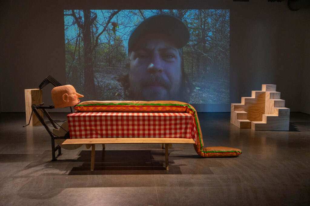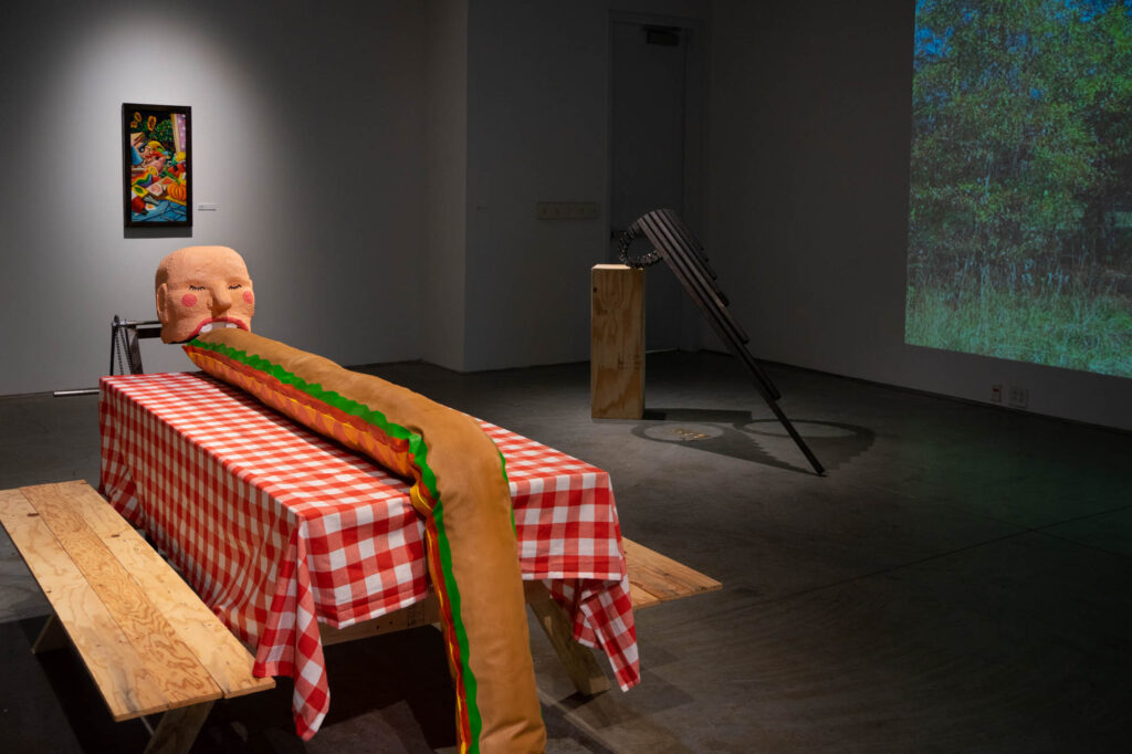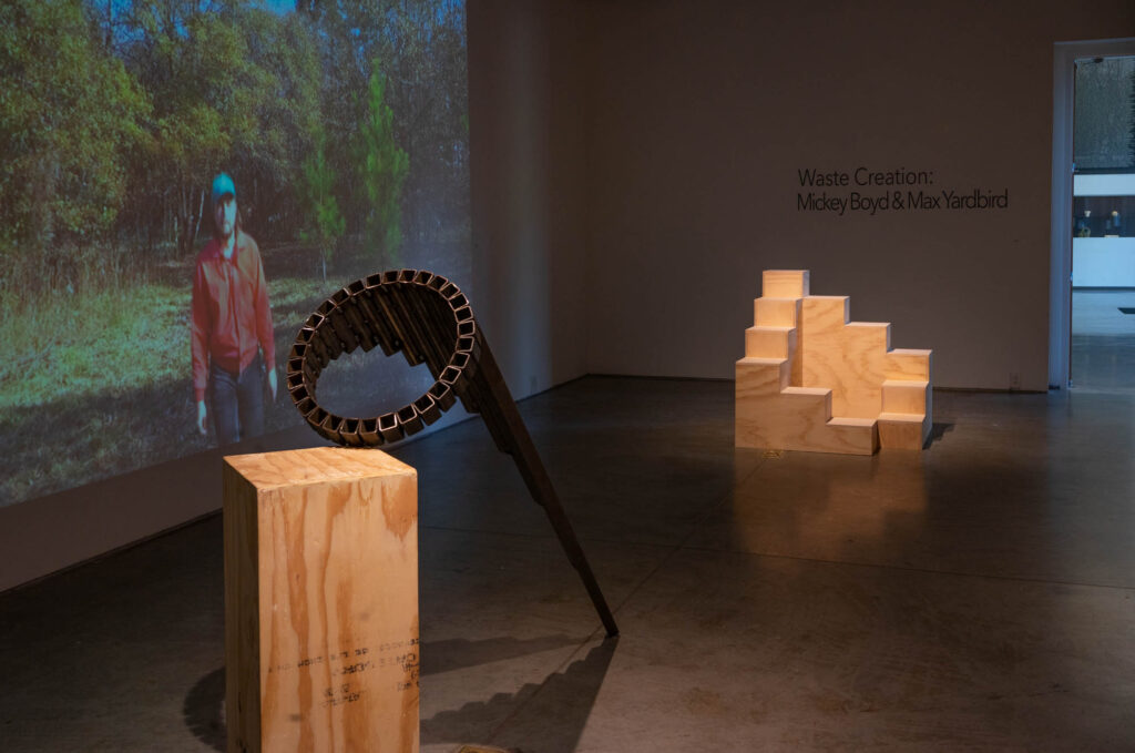 Dodd MFA candidate, Mickey Boyd, and frequent collaborator, Albuquerque-based artist, Max Yardbird present Waste Creation, a collaborative art installation many years in the making. Most of the initial ideas can be traced to late nights spent drawing together in shabby apartments, watching 1990’s VHS’s of bad action movies in Denver, Colorado, where they both originate. The persistent grind of low paid construction labor and the lingering effects of the great recession, created in both artists a satirical sense of humor to cope with the continuing dread of high rent, high stress, and desperate people that tend to exist in big, expensive cities. Waste Creation explores how exponential growth equals exponential waste. This waste is not only physical, but exists beyond in the verbal, political, capitalist, and digital realms. Relentless information, true and untrue, piles up on the services we use to disseminate information just as waste products pile up endlessly in our landfills, atmosphere, and oceans. The collection of images and sculptures mock this set of circumstances, in an attempt to understand the many cultural facets that lead us into a never ending cycle of waste creation.