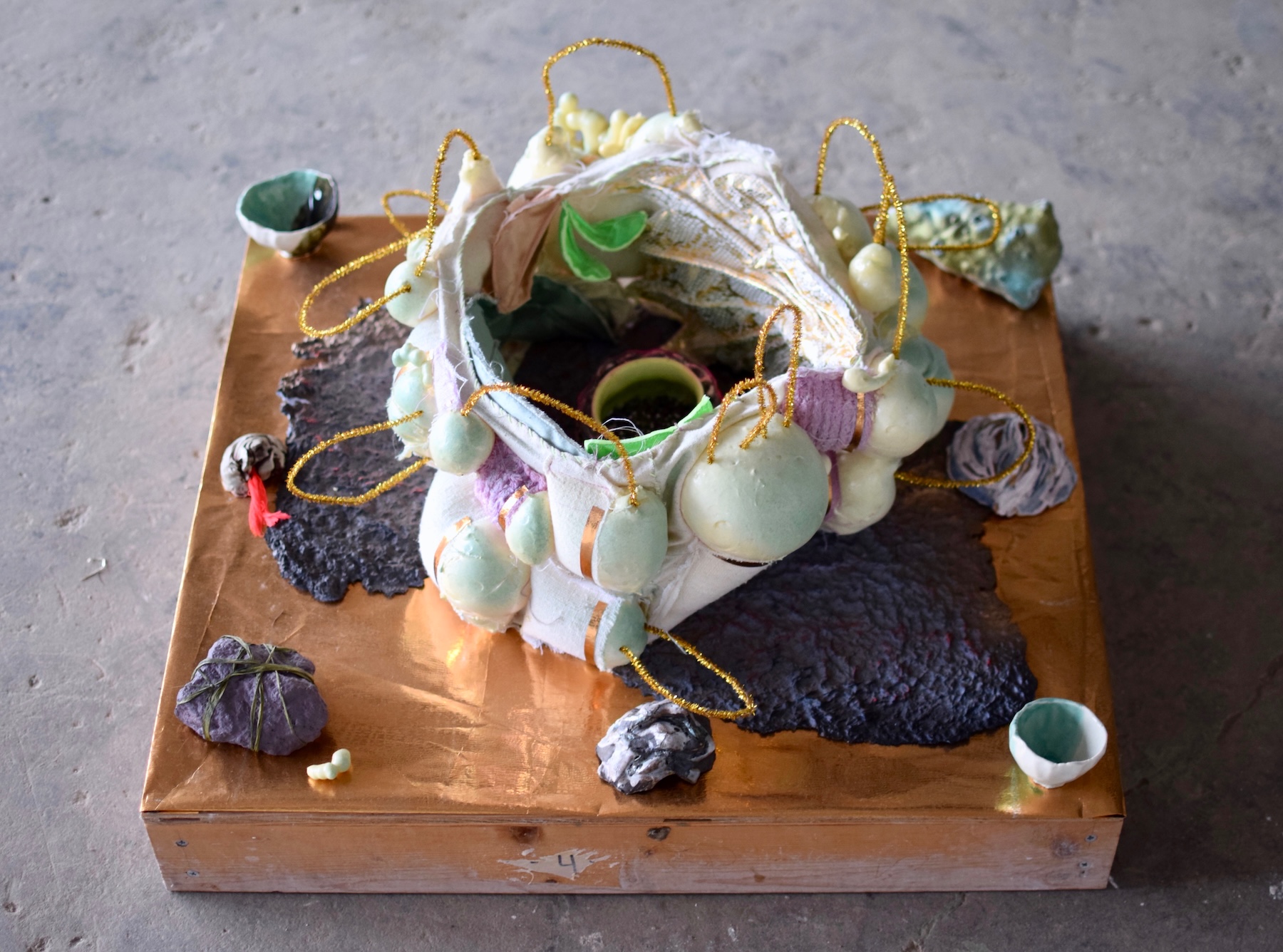 Zipporah Camille Thompson’s recent works in Optical Illusion juxtapose organic and inorganic materials to connote that which cannot be readily seen. “Clay is malleable and responsive and I appreciate its rapid memory of what I have asked it to do,” explains Thompson.”Intangible and invisible are made visible via textiles and clay, two mediums by which each fingerprint, each memory is imprinted onto the surface and is deeply embedded into the structure.” While clay and textiles reveal the history of their making, the found objects in these works such as insulation, foam, and roofing tile, point to industry and mass consumption.