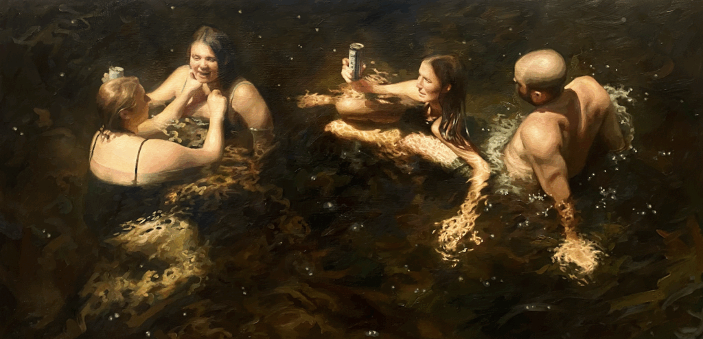 I paint from personal photographs, seeking moments that transcend their immediate context—moments of domestic intimacy, fleeting connections, and people interacting with nature. Through light and water, I explore transformation, ephemerality, and the numinous. My practice draws from Genre scenes, Romantic spirituality, and Baroque drama, elevating the mundane by imbuing it with emotional and spiritual weight. The physicality of painting becomes a dance between holding and releasing, balancing representation with abstraction. Swirling marks of joy and melancholy evoke time, memory, and the unseen, offering a contemplative alternative to today’s proliferation of images. In a world of passive consumption, my work resists disposability and offers a space for contemplation—an invitation to see, to feel, to believe in something beyond the surface.