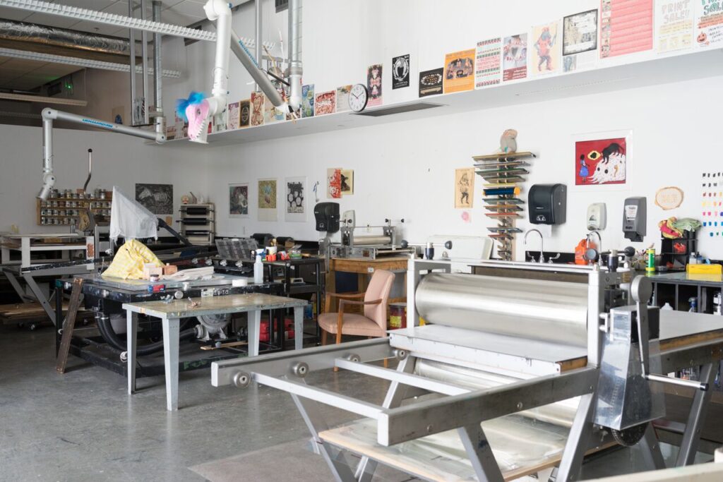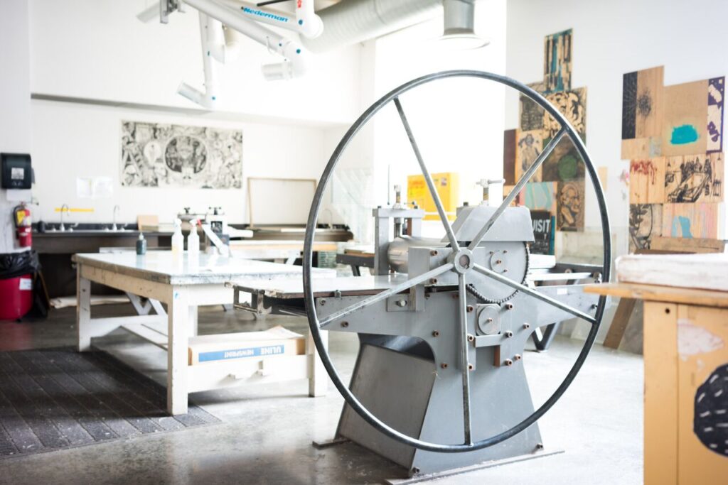 Housed in the main building of the Lamar Dodd School of Art, the Printmaking and Book Arts Area occupies nearly 10,000 square feet with six separate studios on two floors. Spaces include private graduate and faculty studios; a digital output lab and archives; lithography, intaglio, and relief studios; a screenprinting and dark room; a dedicated letterpress studio; a papermaking and book arts room; as well as a dedicated project space. Nearly all of our spaces offer large windows with natural lighting and excellent ventilation.