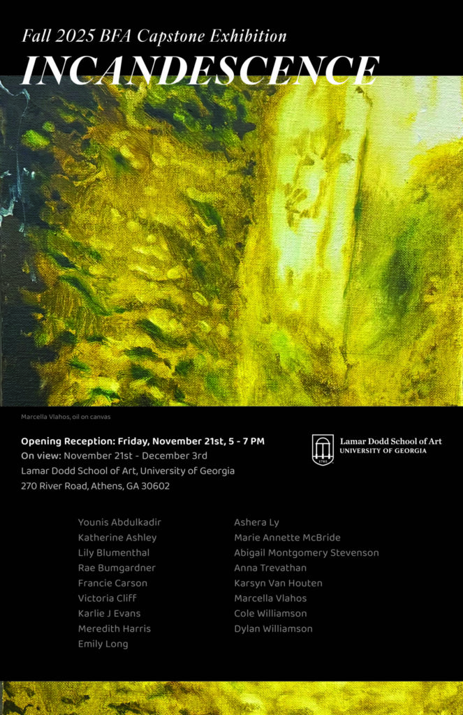 The Lamar Dodd School of Art proudly presents INCANDESCENCE: BFA Fall 2025 Capstone Exhibition. The opening reception will be held Friday, November 21, from 5 to 7 pm in the Dodd Galleries of the school’s Main Art Building on East Campus. The exhibition will be on view through December 4th.