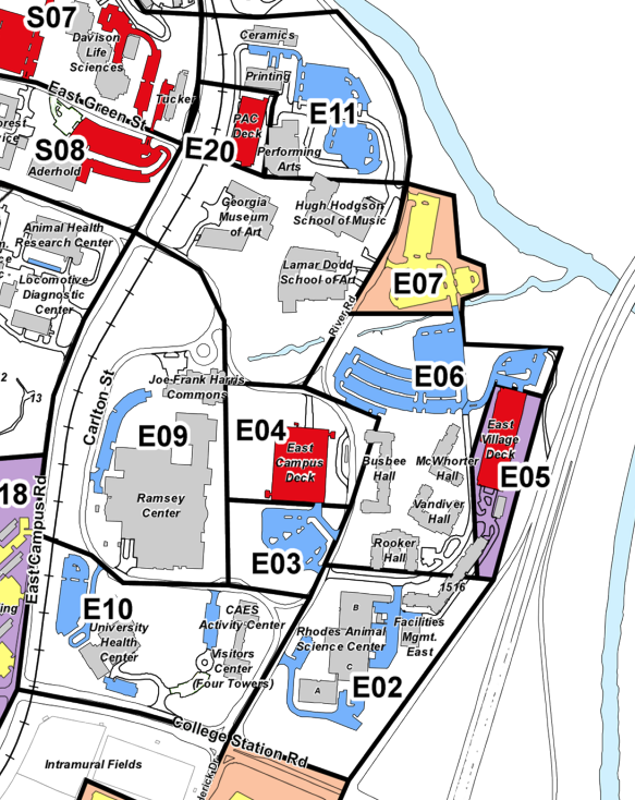 There are two parking decks close to the Dodd: the East Campus Parking Deck and the Performing Arts Center (PAC) Parking Deck (see map).