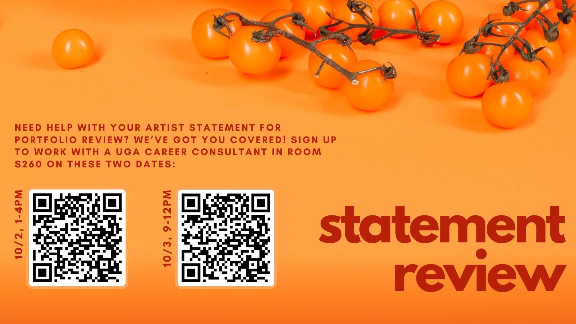 Oct 2 Artist Statement Review | UGA Career Center October 2nd, 2023 at 1:00 pm Lamar Dodd School of Art | S260 October 2nd, 2023 at 1:00 pm Lamar Dodd School of Art | S260