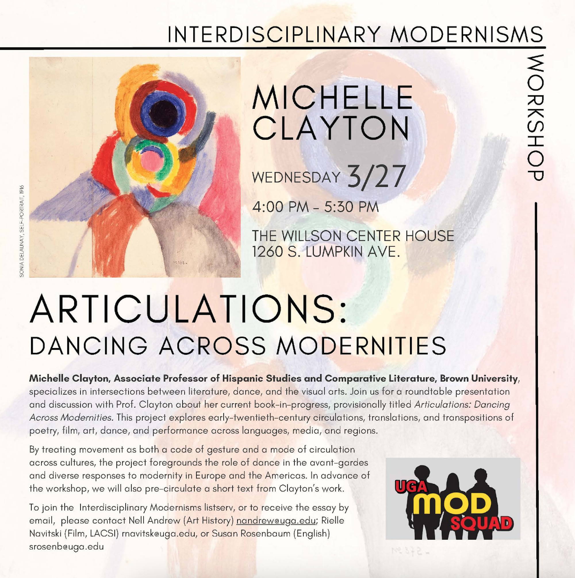 Mar 27 Articulations: Dancing Across Modernities March 27th, 2024 at 4:00 pm Willson Center for the Humanities and Arts | 1260 S. Lumpkin March 27th, 2024 at 4:00 pm Willson Center for the Humanities and Arts | 1260 S. Lumpkin