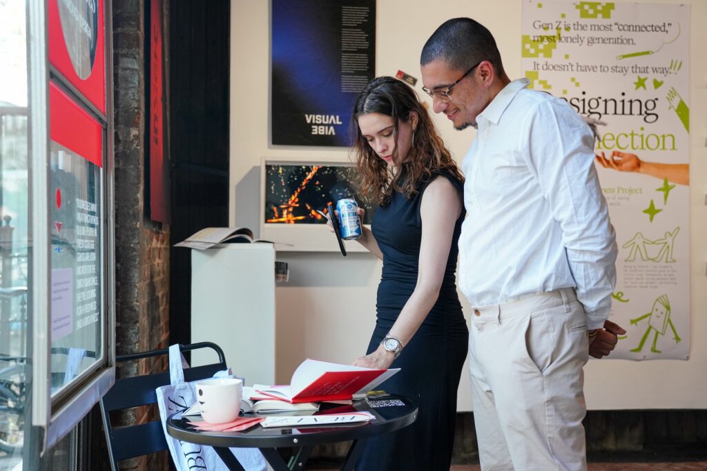 Image: Guests enjoying student work in graphic design exhibition Close to Home at Whitespace Gallery, Atlanta, April 20, 2024. Image courtesy of Sidney Chansamone.