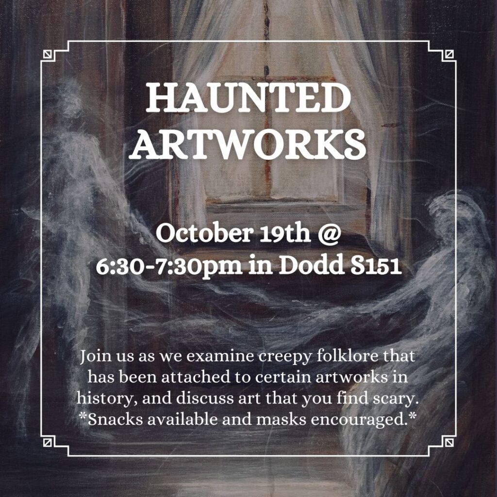 Join the members of the Art History Society as we examine creepy folklore that has been attached to certain artworks in history, and discuss art that you find scary. Non-members are welcome. Snacks will be provided, and masks are encouraged but not required.