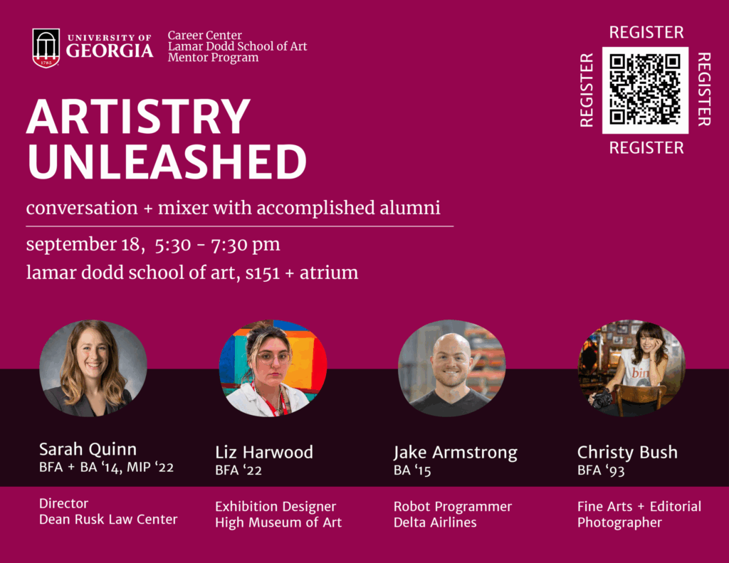 Translating the major you love to a career you’ll love can be a challenge. At this event, presented by the Lamar Dodd School of Art in partnership with the UGA Career Center and the UGA Mentor Program, a panel of Lamar Dodd alumni will join us to share information about their careers, including how they chose to incorporate the arts into their career paths and what steps they took to successfully carve their lives after graduation. Our panelists will offer practical advice to help you begin planning your future careers as well as offer vivid examples of how you can incorporate your love of the arts into your professional life. There will also be a networking hour at the end!