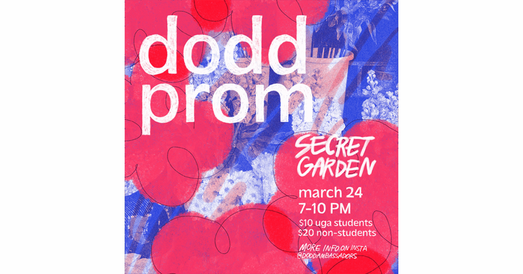 The first ever Dodd Prom is happening on Friday, March 24th from 7-10 PM! The Dodd Ambassadors are excited to host this event in the first floor atrium and courtyard of the main building of the Lamar Dodd School of Art on 270 River Road. Come dressed in formal attire and dance the night away with friends and enjoy a mocktail bar. Buy your tickets at the door with cash or Venmo.