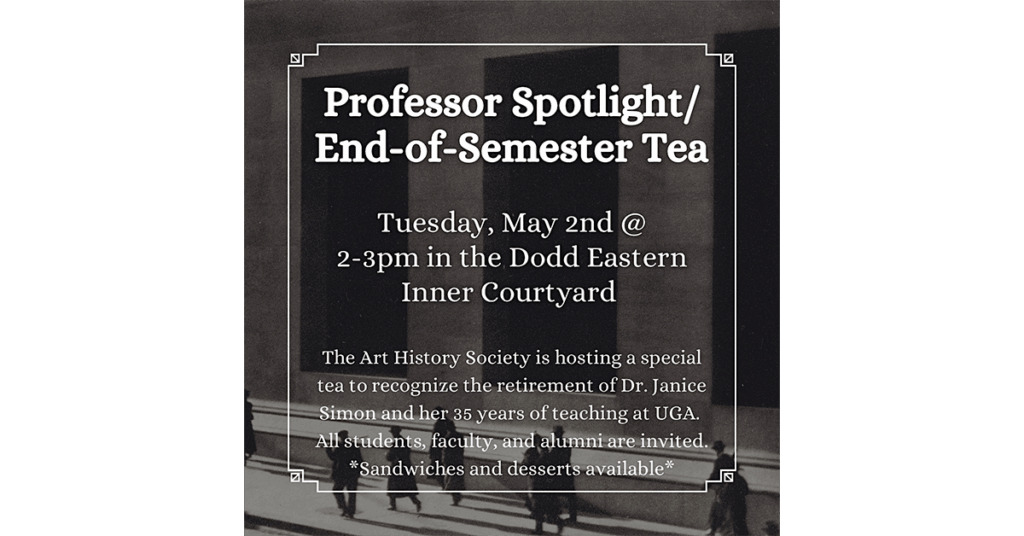 The Art History Society is hosting a special tea to recognize the retirement of Dr. Janice Simon and her thirty-five years of teaching at the University of Georgia. Desserts and tea will be available in the inner courtyard. All students, faculty, and alumni are invited.