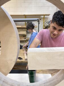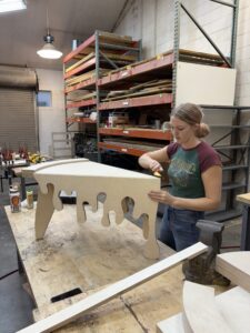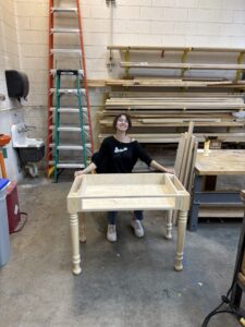Student in wood shop at Thomas Street Arts Complex working on project for Lecturer Jason Wech’s Fall 2025 Furniture Design Class (ARID 3340).