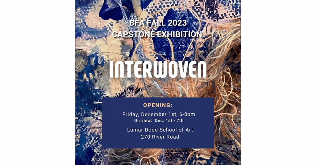 Save the date for a spectacular evening! Join us at the Lamar Dodd School of Art in Athens, GA for “Interwoven: BFA Fall 2023 Capstone Exhibition”. Immerse yourself in the diverse talents of 13 graduating BFA students spanning ceramics to photography. Don’t miss this mesmerizing showcase celebrating identity, nature, and the human experience.