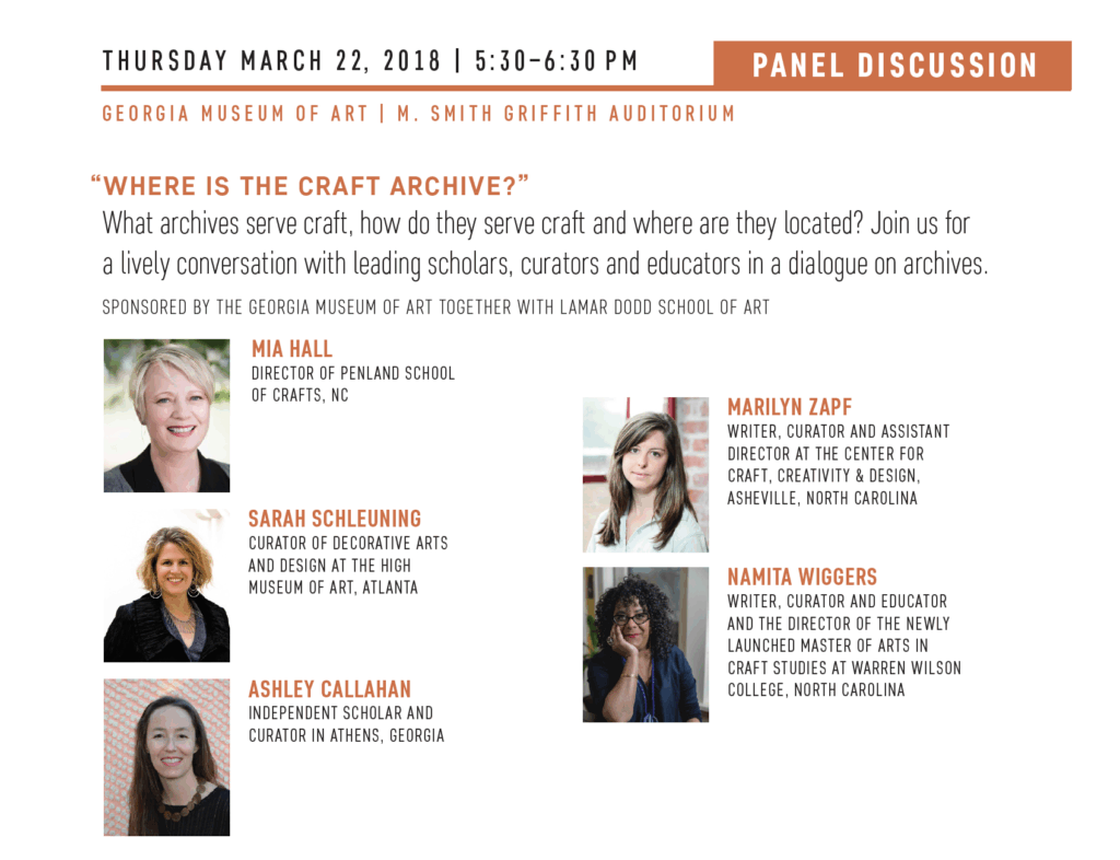 HomeEvents Panel Discussion: Where is the Craft Archive? March 22nd, 2018 at 1:30 pm Add to Calendar Google Calendar iCalendar (.ics) Outlook 365 Outlook Live Date & Time March 22nd, 2018 at 1:30 pm LocationGeorgia Museum of Art, M. Smith Auditorium SponsorSponsored by the Georgia Museum of Art with Lamar Dodd School of Art Upcoming EventsView All Events October 14 Visiting Artist Lecture | Jen de los Reyes October 14th, 2025 at 5:30 pm 270 River Road | S150, Main Building October 14th, 2025 at 5:30 pm 270 River Road | S150, Main Building October 16 AGAS Guest Lecture with Dr. Carolina Mangone October 16th, 2025 at 5:30 pm Lamar Dodd School of Art | S150 October 16th, 2025 at 5:30 pm Lamar Dodd School of Art | S150 October 23 Graduate Studies Virtual Info Session | Art Education October 23rd, 2025 at 7:00 pm Zoom October 23rd, 2025 at 7:00 pm Zoom November 5 Graduate Studies Virtual Info Session | MFA Studio Art November 5th, 2025 at 12:30 pm Zoom November 5th, 2025 at 12:30 pm Zoom November 7 Fall 2025 Dodd Market November 7th, 2025 at 11:00 am Lamar Dodd School of Art | Atrium + Courtyard November 7th, 2025 at 11:00 am Lamar Dodd School of Art | Atrium + Courtyard