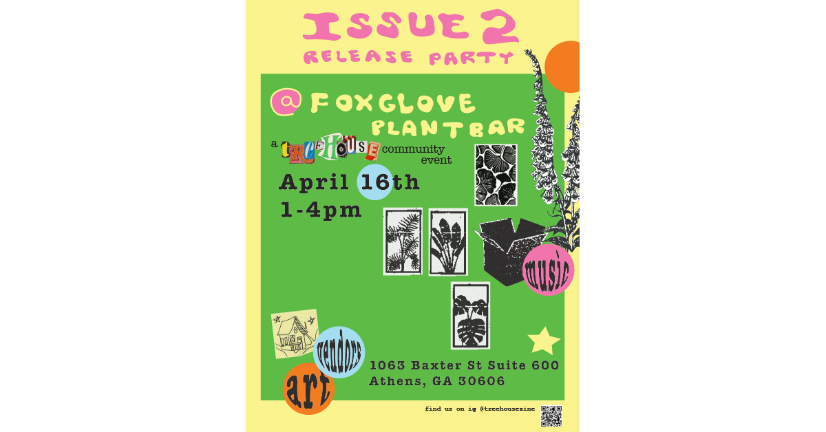 Apr 16 Treehouse Zine Issue 2 Release Party April 16th, 2023 at 1:00 pm Athens, Foxglove Plantbar | 1063 Baxter St Suite 600, GA 30606 April 16th, 2023 at 1:00 pm Athens, Foxglove Plantbar | 1063 Baxter St Suite 600, GA 30606