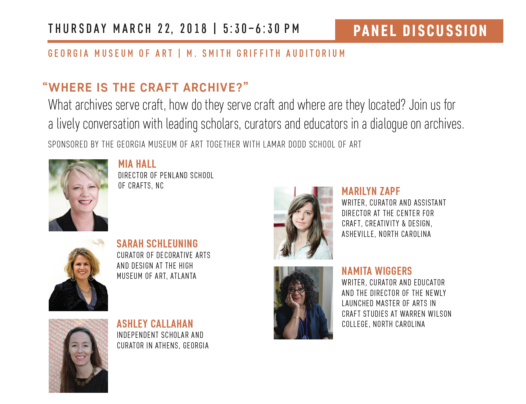 Mar 22 Panel Discussion: Where is the Craft Archive? March 22nd, 2018 at 1:30 pm Georgia Museum of Art, M. Smith Auditorium March 22nd, 2018 at 1:30 pm Georgia Museum of Art, M. Smith Auditorium