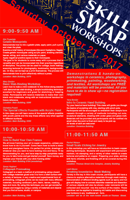 Oct 20 Skill Swap Workshops II October 20th, 2017 at 8:00 pm Various Art Building Locations October 20th, 2017 at 8:00 pm Various Art Building Locations