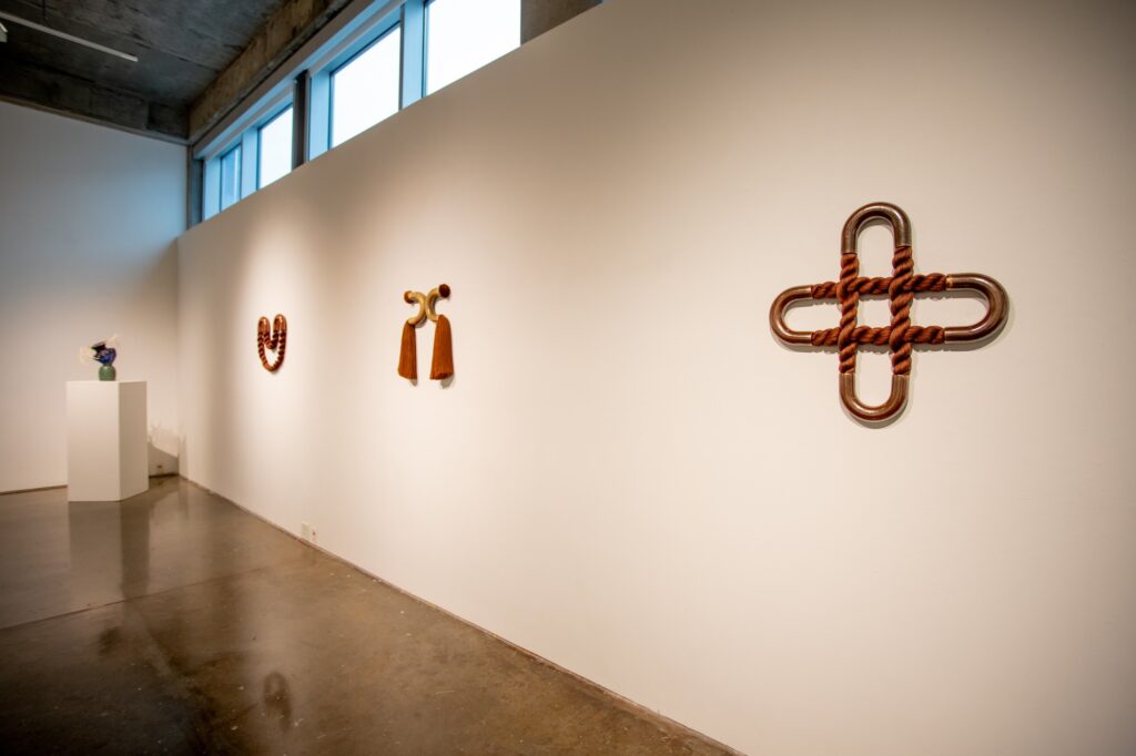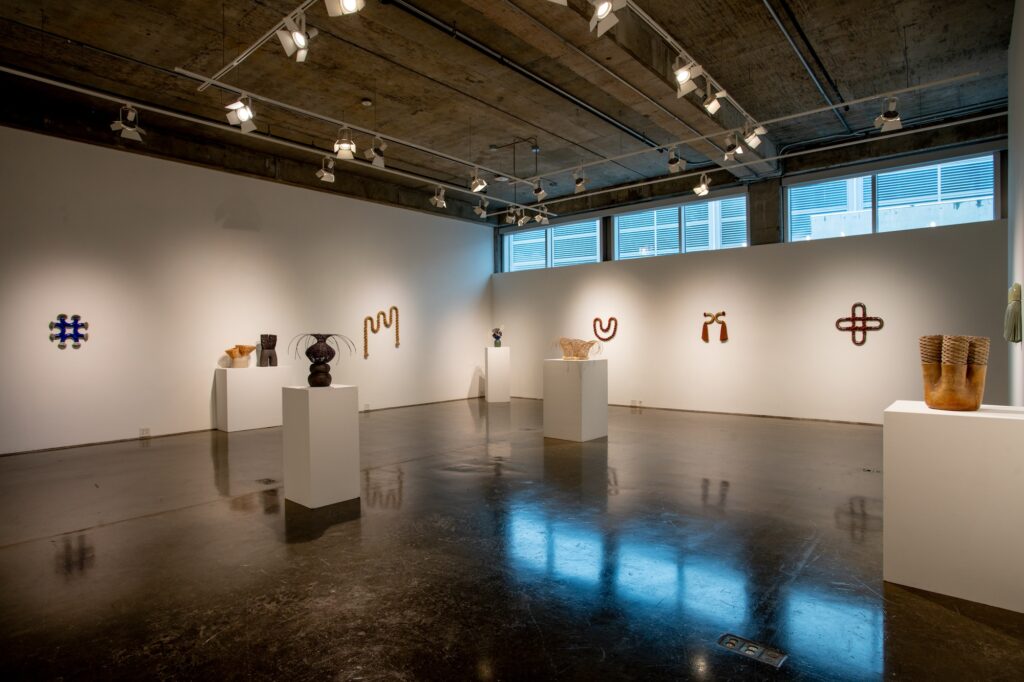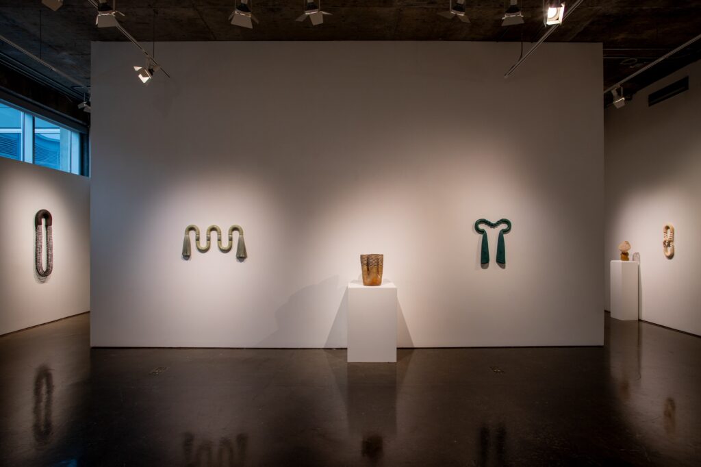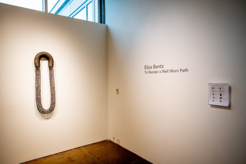 To Wander a Well Worn Path presents the act of weaving, a millennia-old tradition rooted in survival and functionality, in relation to contemporary abstraction and mixed media practices. Dodd MFA candidate Eliza Bentz investigates the integrity and aesthetic of weaving, tracing and in some cases magnifying, the journey of a line as it emerges into an intertwined network. The resulting works are an assemblage of ceramic and fiber sculptures, activating both the vertical and horizontal plane as organic vessels and meandering wall works. By participating in the tactility and skill of handcraft, Bentz proves that the inclinations and tactics of those who came before us are not so far behind.