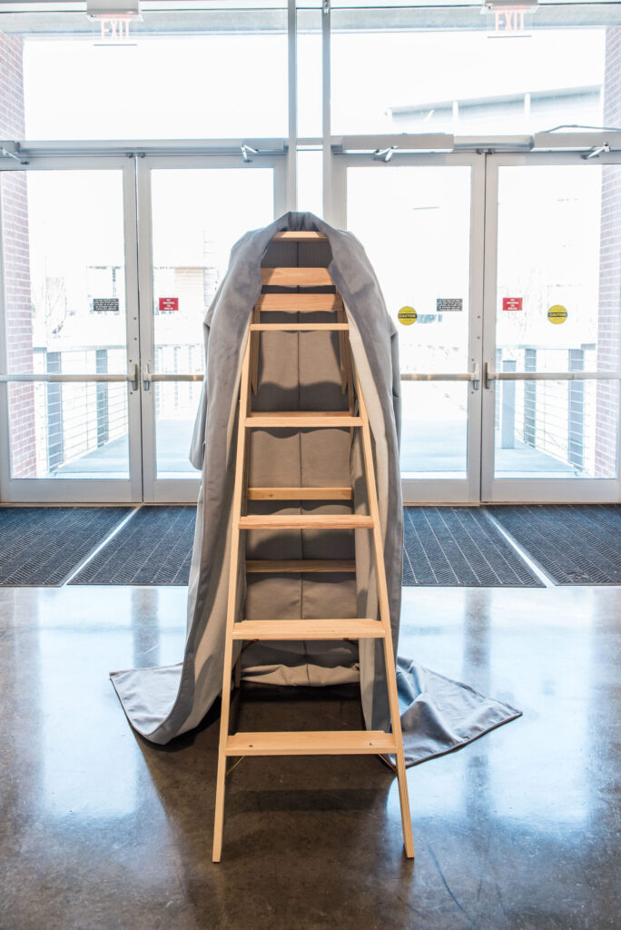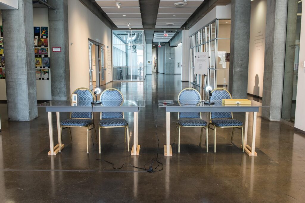 Here, Say is a new sculptural installation by Dodd post-MFA fellow in sculpture, Courtney McClellan. The installation, comprised of made and found objects, recreates a courtroom. With absurdity and poetry, the judicial system and its players are recast. Witness, defendant, plaintiff, judge, and jury conflate seeing and speaking, hearing and being seen. In this space theories are performed, arguments are made. Located at an entrance of the Lamar Dodd School of Art, the work invites practice, play and judgment.