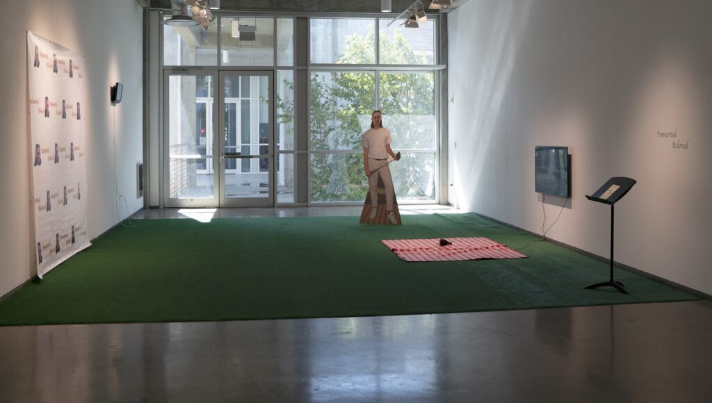 The installation invites viewers to participate and perpetuate their own image, providing opportunities to emulate and engage with the simulated Youtube star. Immortal Beloved challenges authenticity as the artist’s image takes precedence over place, and questions where the ‘real’ might exist if everything is performed. Is this a new phenomenon, or have methods of technology always vacated sincerity?