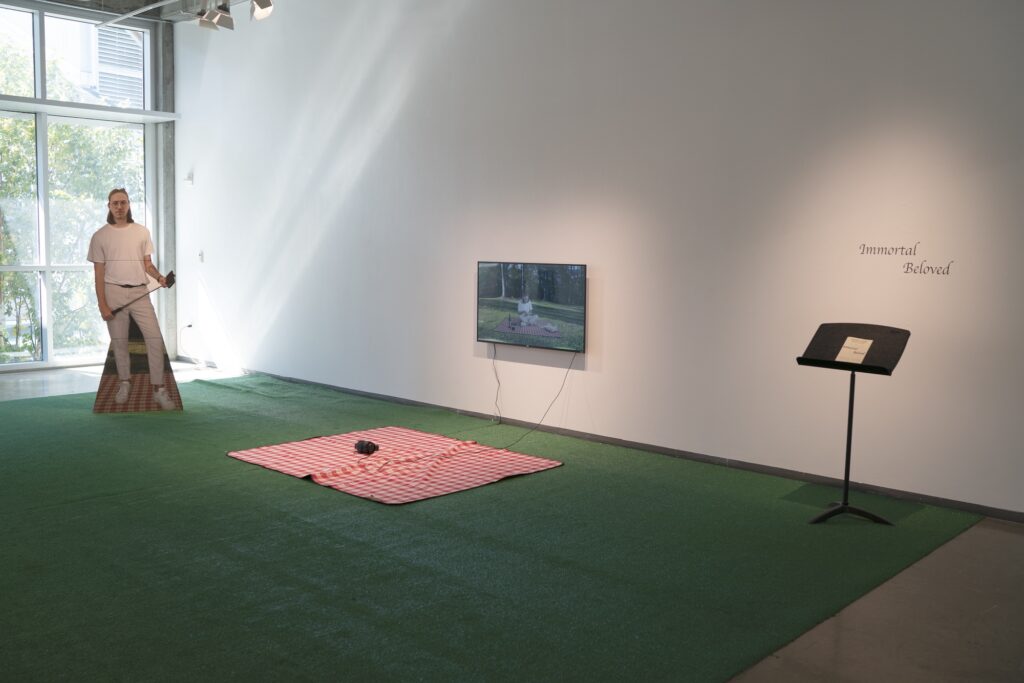 In this exhibition, Dodd MFA candidate Robby Toles reimagines the amateur Youtube vlog with a dedicated audience as a romantic production for a singular recipient, Immortal Beloved. Toles inhabits the role of influencer as he recites a 19th century love letter written by Ludwig van Beethoven. Simultaneously speaking to the viewer, his phone, and his own reflection, Toles flirts with his mirror image in a Narcissusian curse.