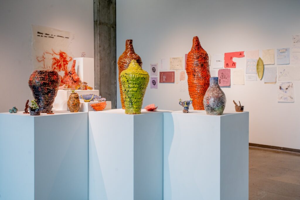 Insect Politics combines disparate vessels to conjure an interpretation of divinity that is both atmospheric and physical. Dodd MFA candidates Hayden Maltese and Alejandro Ramirez present reflective texts, musical instruments, ceramic objects, and a site-specific installation in an attempt to capture what is transitory and fleeting by nature. Visual investigations are thus fractured, utilizing ubiquitous imagery from pop culture and day-to-day life, whether pastoral, urban, or subconsciously present. A collective that is of eternal flux and subject to all possible changes, this installation coagulates, for an ephemeral moment, something that is presentable — in the search for a Being who is, and is not. This exhibition is curated by MA candidate in Art History, Kaitlyn Morrison.