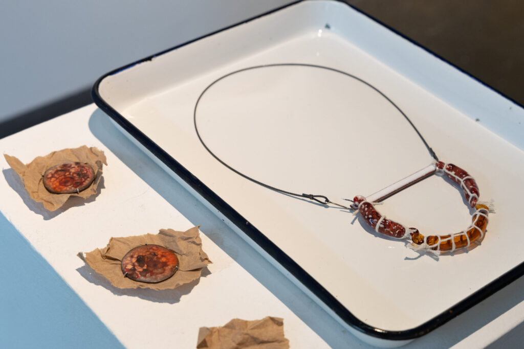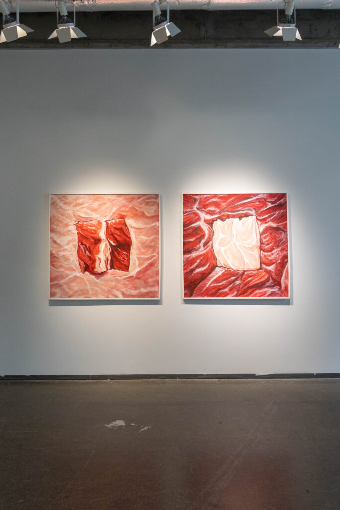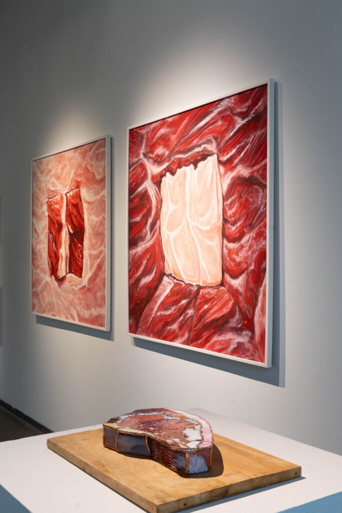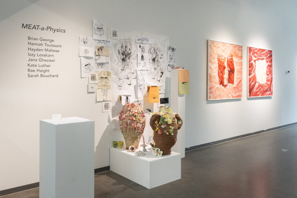 With a pattern of spatial organization that resembles the key elements of the contemporary domestic home, and visual content to match, MEAT-a-physics invites audiences to come in and stay for a while as they ponder and explore what the experienced idea of home living means to them, what it has meant for others before them, and what it will mean for those in the future. Calling on meat and the domestic object as a functional symbol for the individual, artists Brian George, Hannah Touissant, Hayden Maltese, Izzy Losskarn, Jana Ghezawi, Kate Luther, Rae Haight, and Sarah Bouchard put forth a visually diverse exhibition which calls on the viewer to reflect broadly across multiple lines of inquiry related to the conceptual interpretation of Western domesticity. MEAT-a-physics includes a collaborative art-lexicon created by the participating artists, which references ancient civilization glyph systems of language, for the purpose of providing audiences with a tangible and accessible description of the use of symbols across each artists’ work in the exhibition. Lexicons will be provided at the entrance for viewers to investigate and decode the ensemble of personal mythologies, social and cultural relationships, and the metaphysics of domesticity as they navigate throughout the gallery space and the world around them.