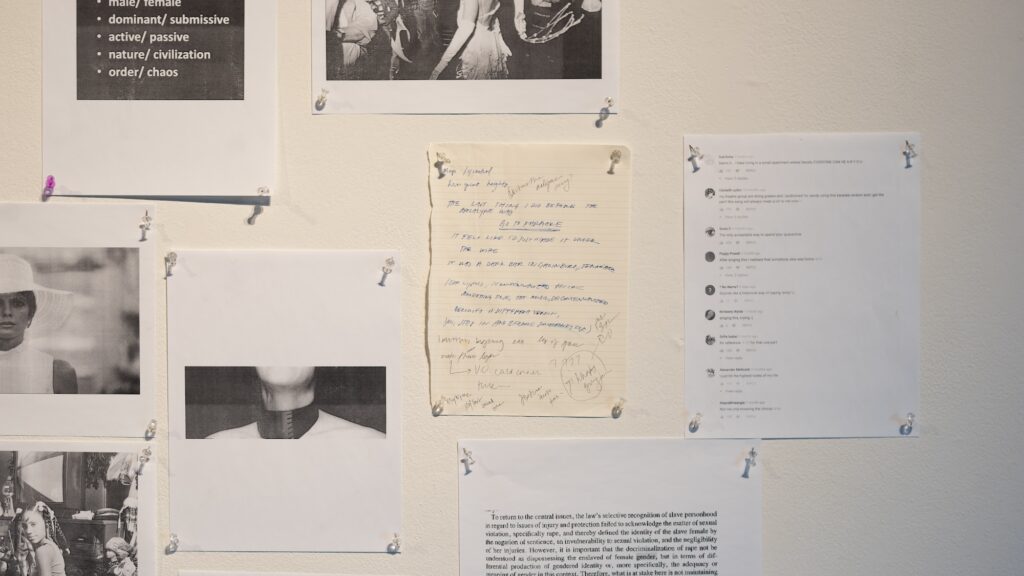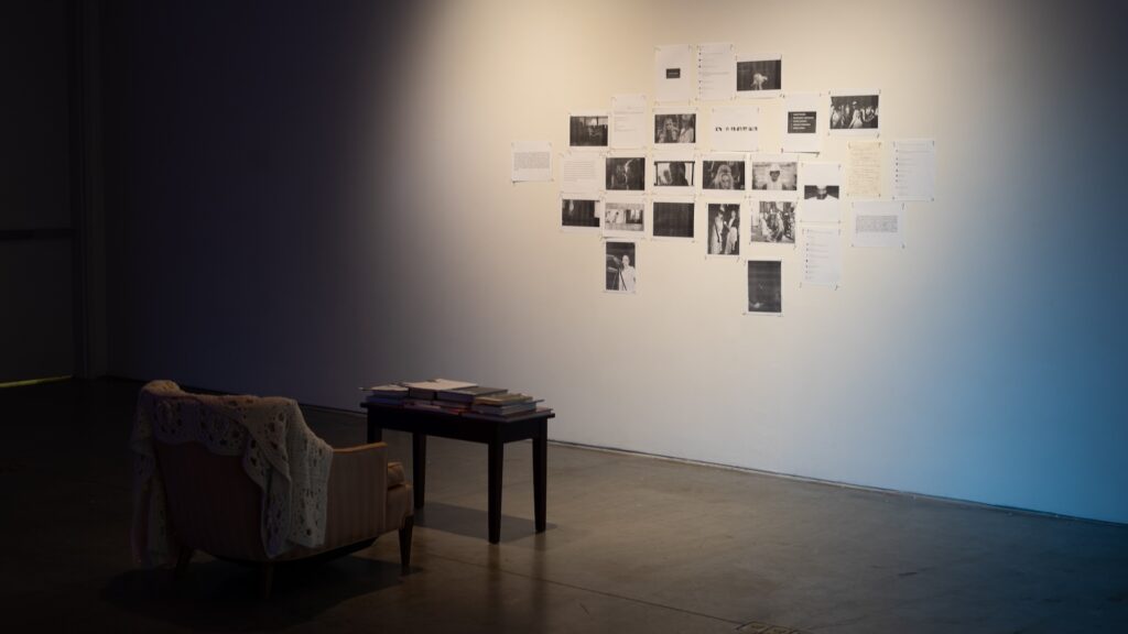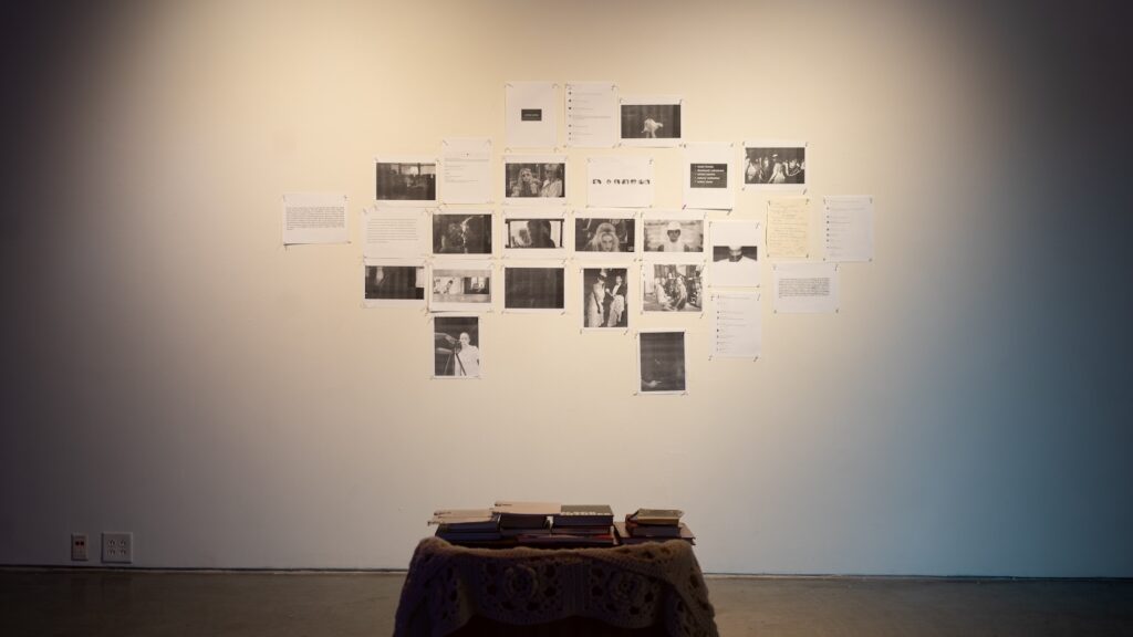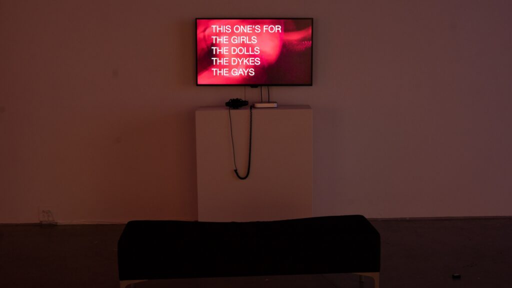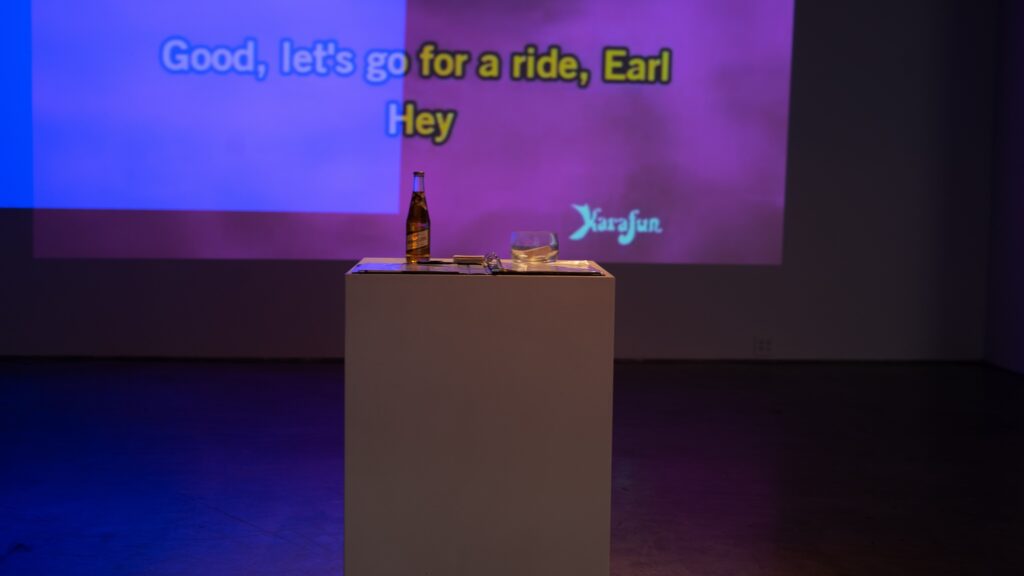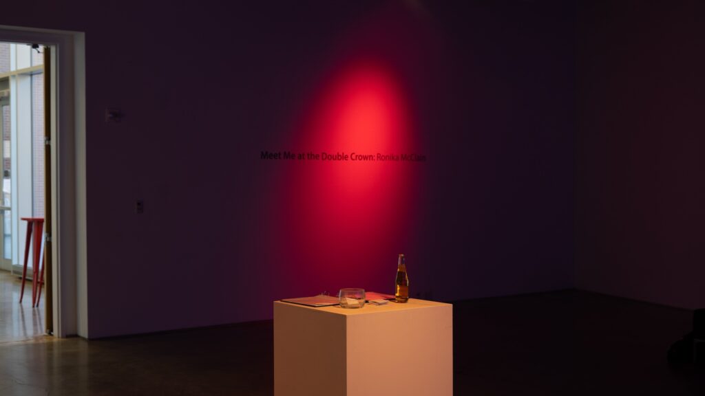 Meet Me At The Double Crown is a tribute to karaoke’s power to find transcendence in the performance of ourselves. Dodd MFA candidate, Ronika McClain, presents a series of videos that uses confessional storytelling to discuss the importance of coming together as a community and the recent disconnection wrought by the pandemic. Named after her favorite karaoke (and otherwise) bar in Asheville, North Carolina, the exhibition presents videos that approximate the intimacy of a friend telling you a favorite story in a dark booth. Yet, McClain is mostly alone, performing for herself or a bored audience of two. Throughout the works. she riffs on ideas of womanhood, of assuming a newfound identity, and of the complex mapping of queer communities. In another video, she stitches together a karaoke megamix crowdsourced video taken from a list of prompts she sent to friends and lovers inviting viewers to sing along. Meet Me at the Double Crown will feature a research lounge; an installation of McClain’s research that contributed to her thinking while making the work.