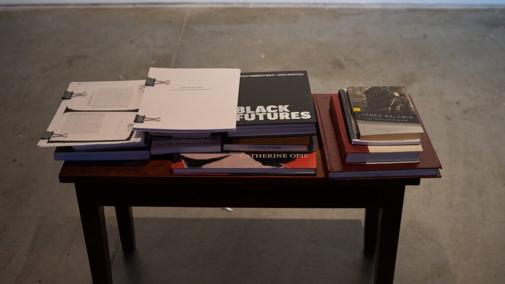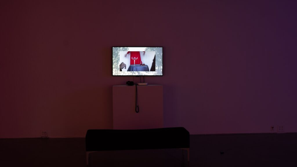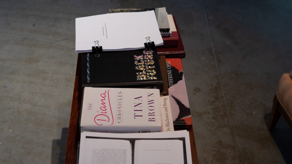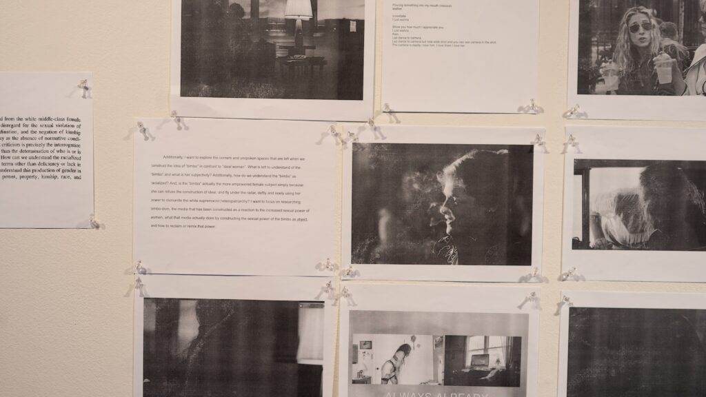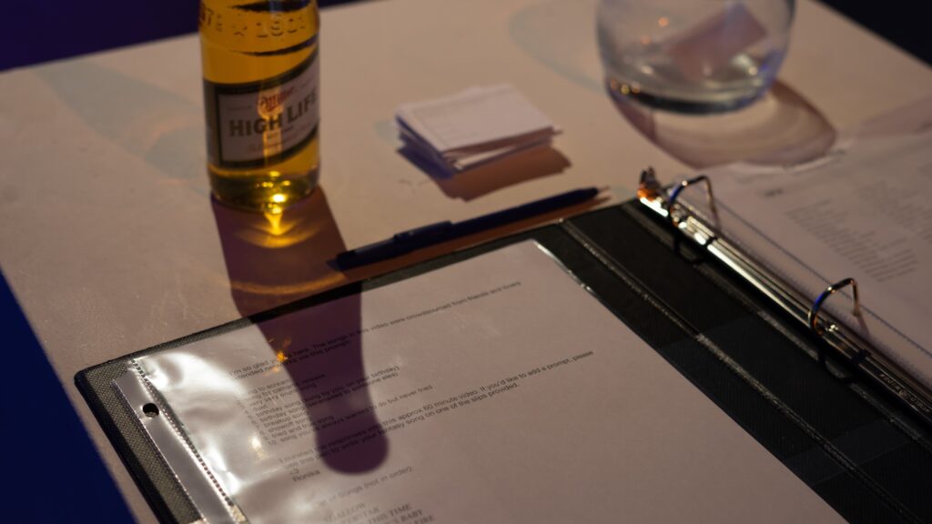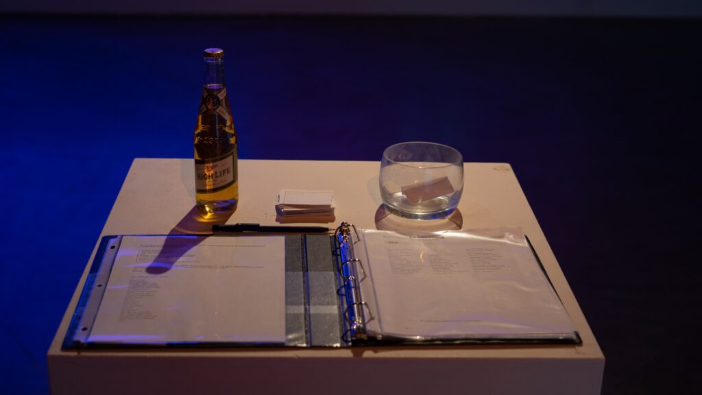 Meet Me At The Double Crown is a tribute to karaoke’s power to find transcendence in the performance of ourselves. Dodd MFA candidate, Ronika McClain, presents a series of videos that uses confessional storytelling to discuss the importance of coming together as a community and the recent disconnection wrought by the pandemic. Named after her favorite karaoke (and otherwise) bar in Asheville, North Carolina, the exhibition presents videos that approximate the intimacy of a friend telling you a favorite story in a dark booth. Yet, McClain is mostly alone, performing for herself or a bored audience of two. Throughout the works. she riffs on ideas of womanhood, of assuming a newfound identity, and of the complex mapping of queer communities. In another video, she stitches together a karaoke megamix crowdsourced video taken from a list of prompts she sent to friends and lovers inviting viewers to sing along. Meet Me at the Double Crown will feature a research lounge; an installation of McClain’s research that contributed to her thinking while making the work.